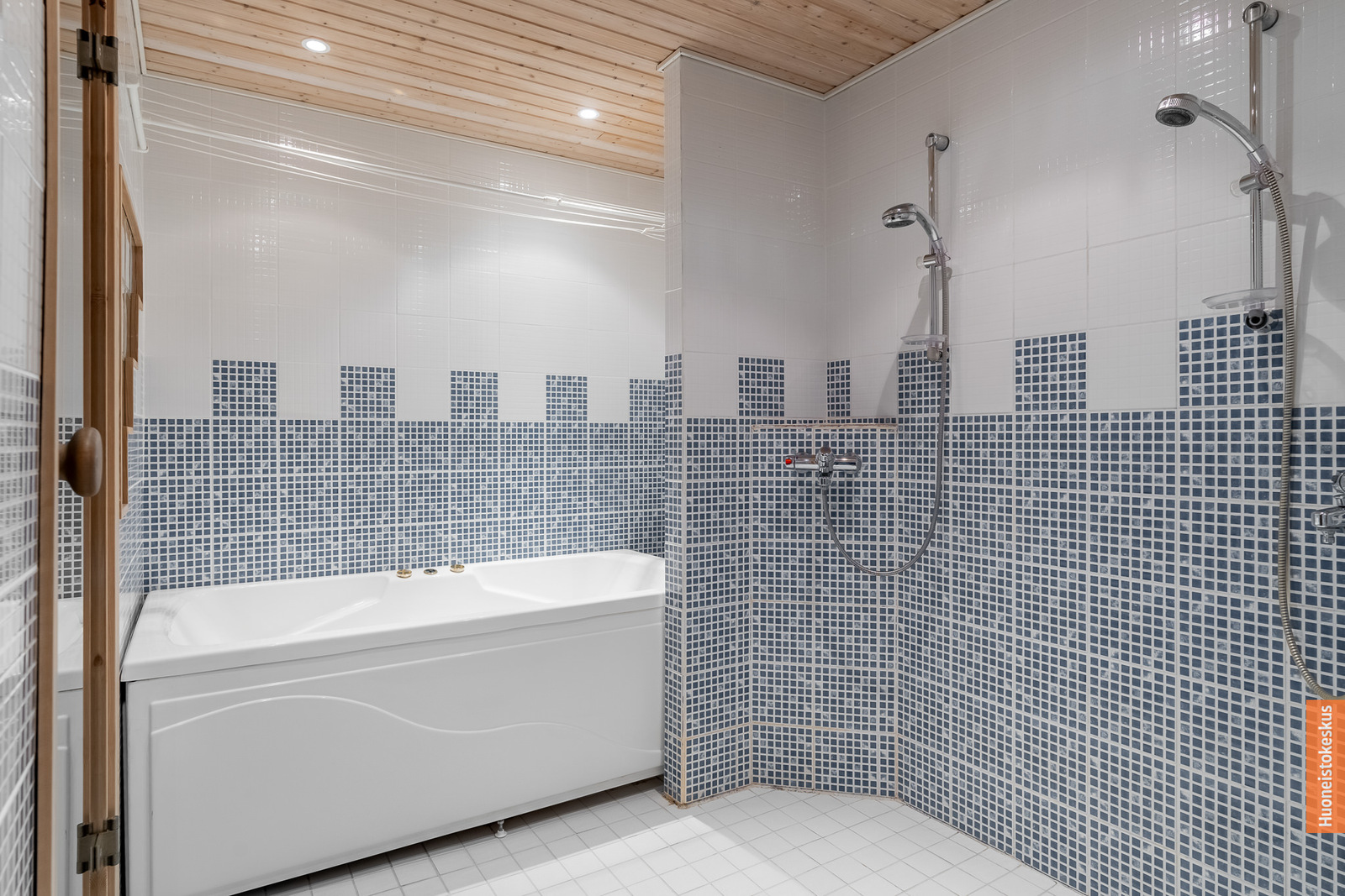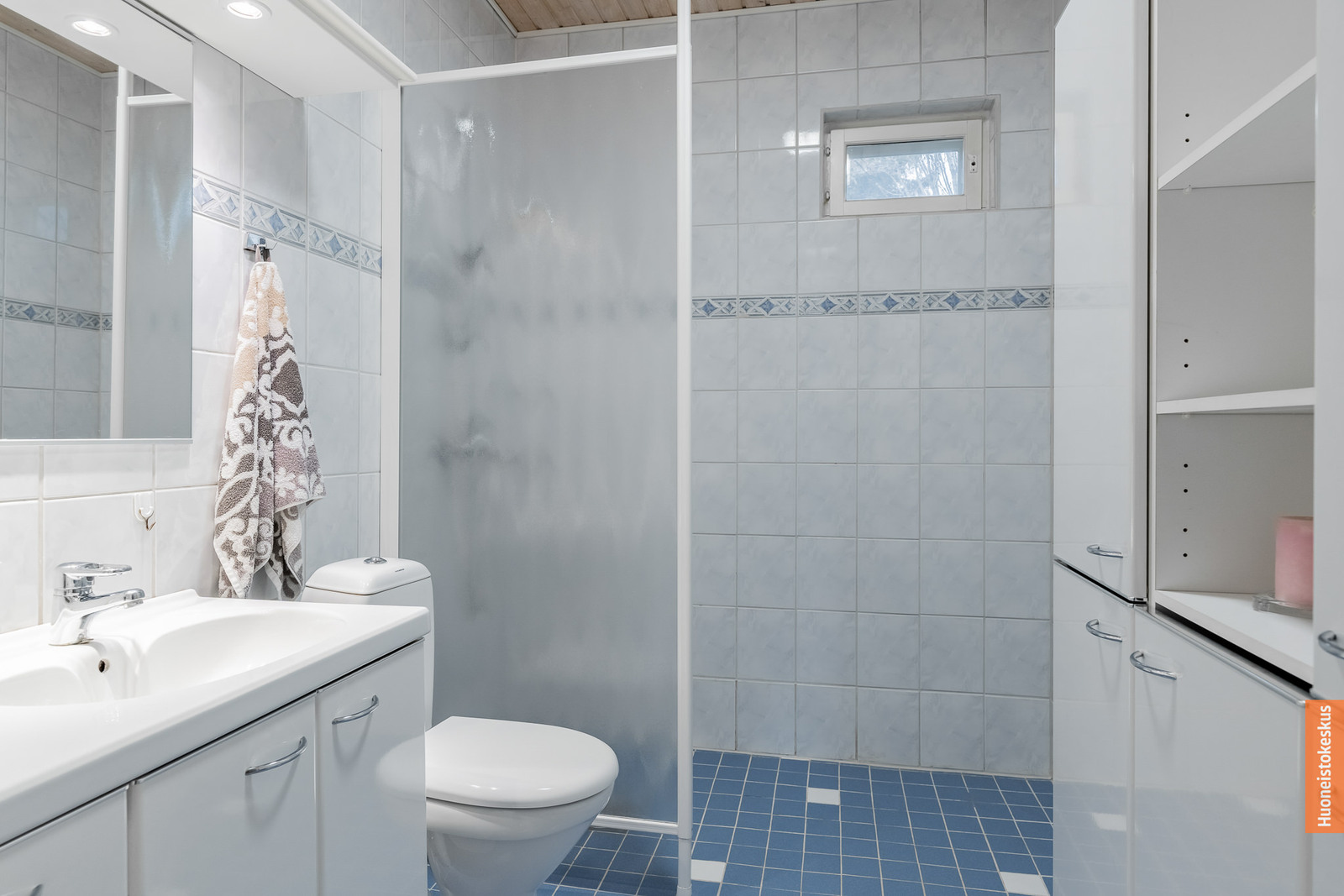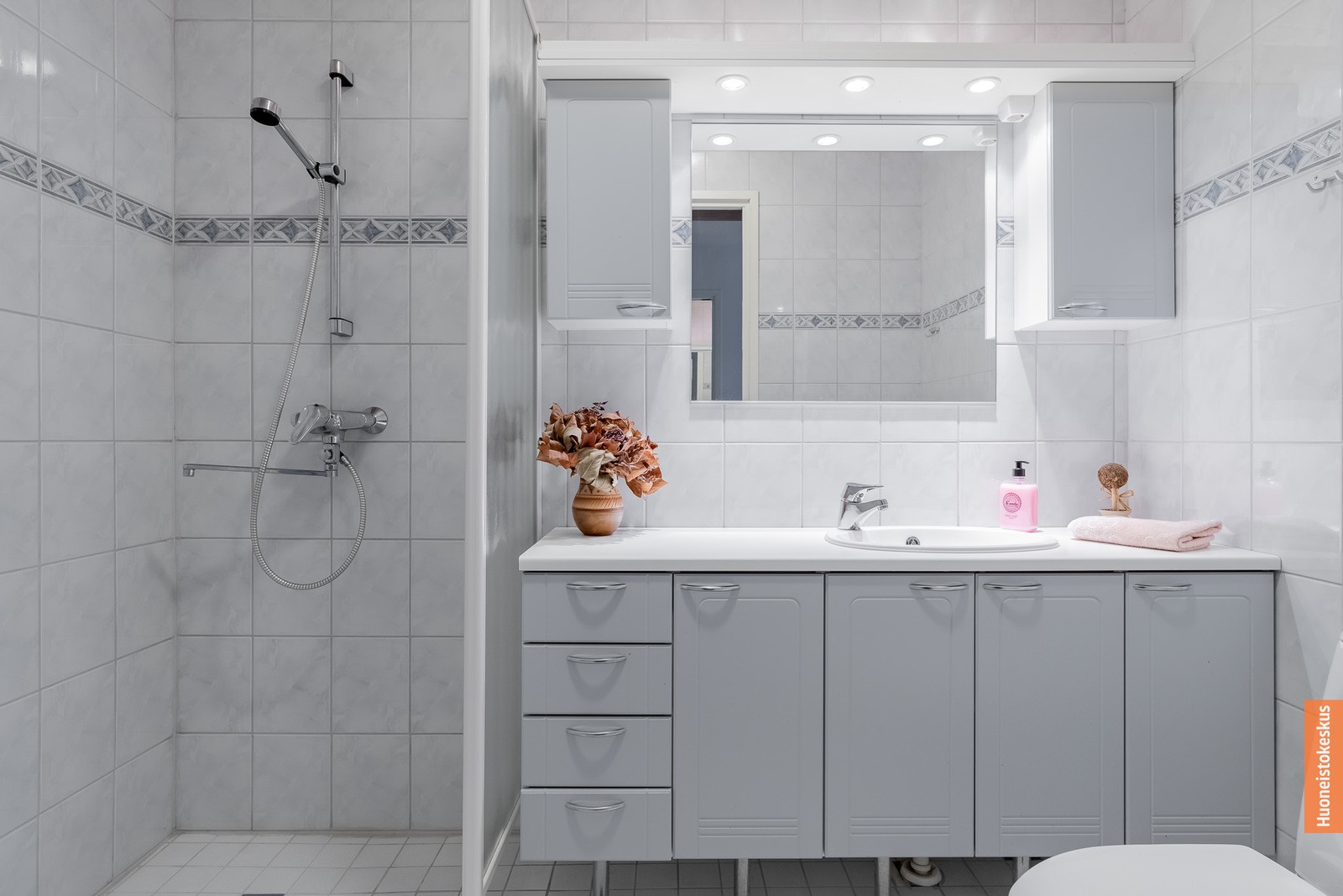 | Kylpyhuoneen kuvaus | Suihku, lattialämmitys, wc-istuin ja allaskaappi, seinät (kaakeli), lattiat (laatta) |