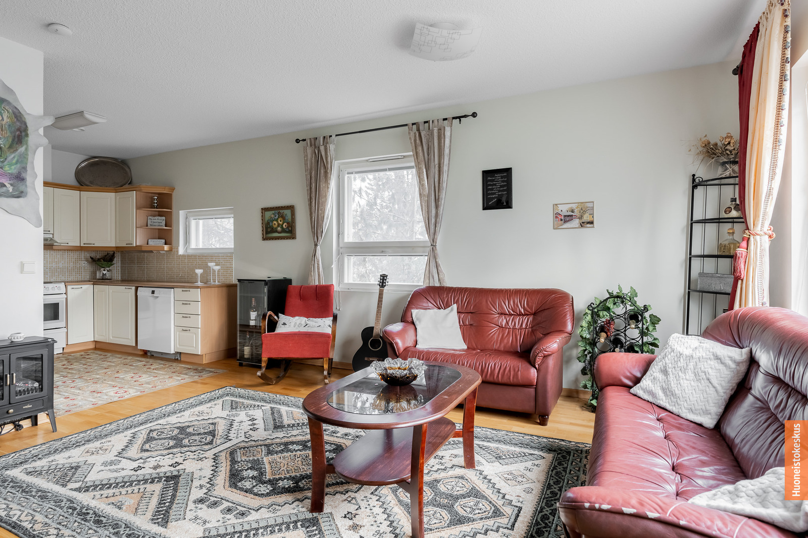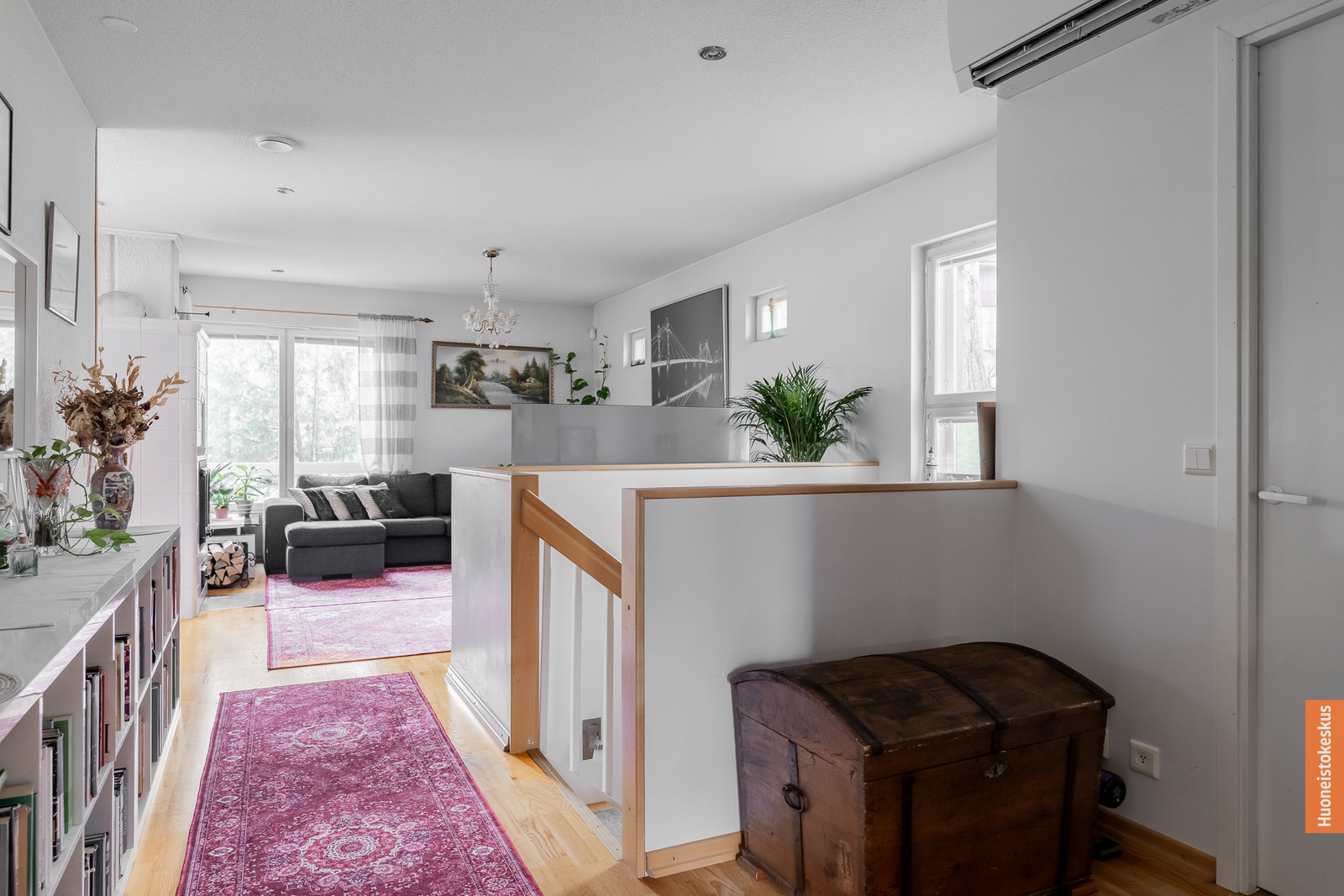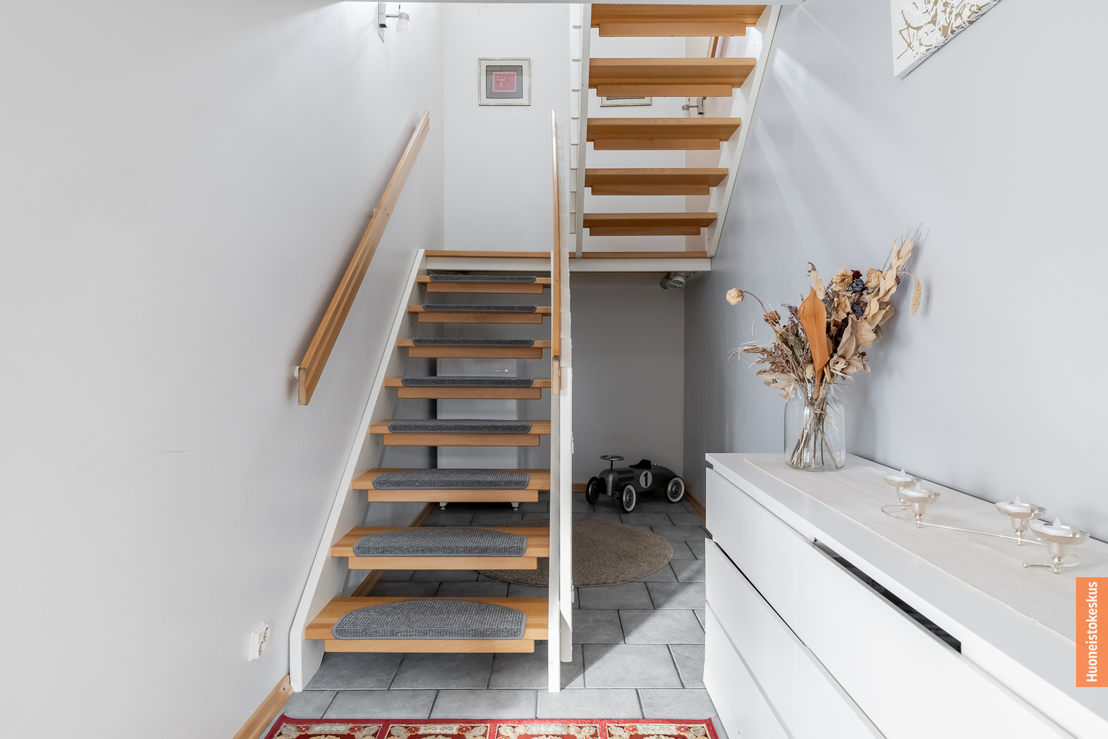 Yläkerrassa sijaitsee pääasunto, jossa tilava ja valoisa olohuone yhdistyy kauniisti varaavan Kermansaven takan ympärille, jossa myös leivinuuni. Keittiö on käytännöllinen ja avautuu tunnelmalliselle lasitetulle terassille, jossa voi nauttia aamukahvit aikaisesta keväästä pitkälle syksyyn. Terassilta on käynti upealle takapihalle, jossa tilaa riittää niin leikkiin, oleiluun kuin puutarhaharrastuksiinkin. Yläkerrasta löytyy myös kaksi tilavaa makuuhuonetta sekä kylpyhuone.