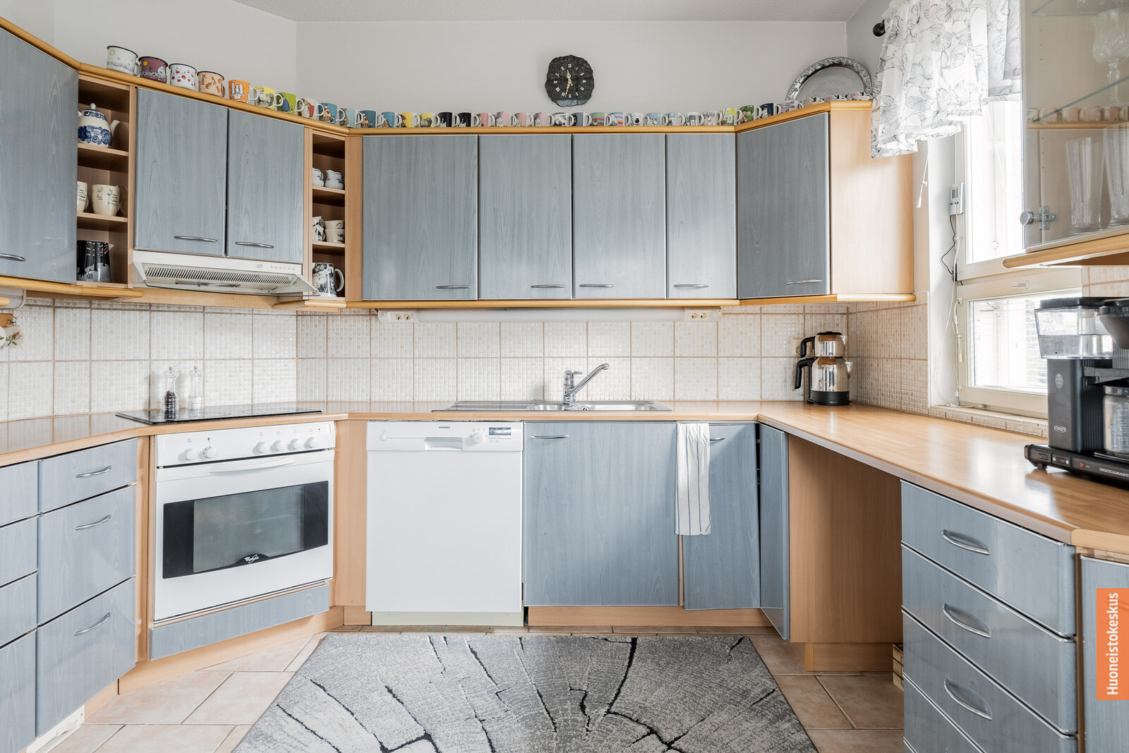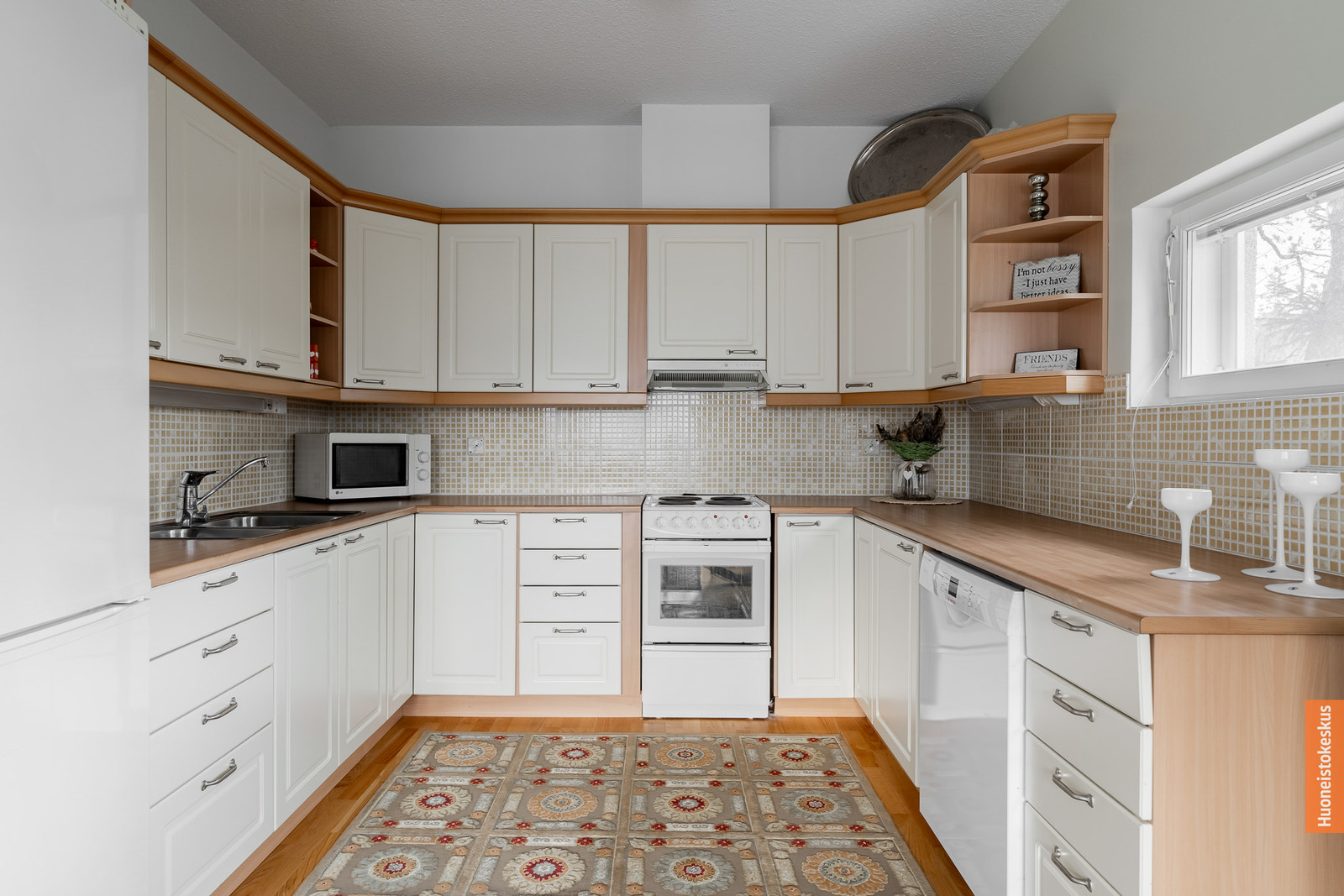 | Keittiön kuvaus | Liesi (Keraaminen liesi ja sähköliesi), työtasot (laminaatti), seinät (maali), lattiat (laatta), liesi, jääkaappi, jääkaappipakastin, liesituuletin ja astianpesukone |