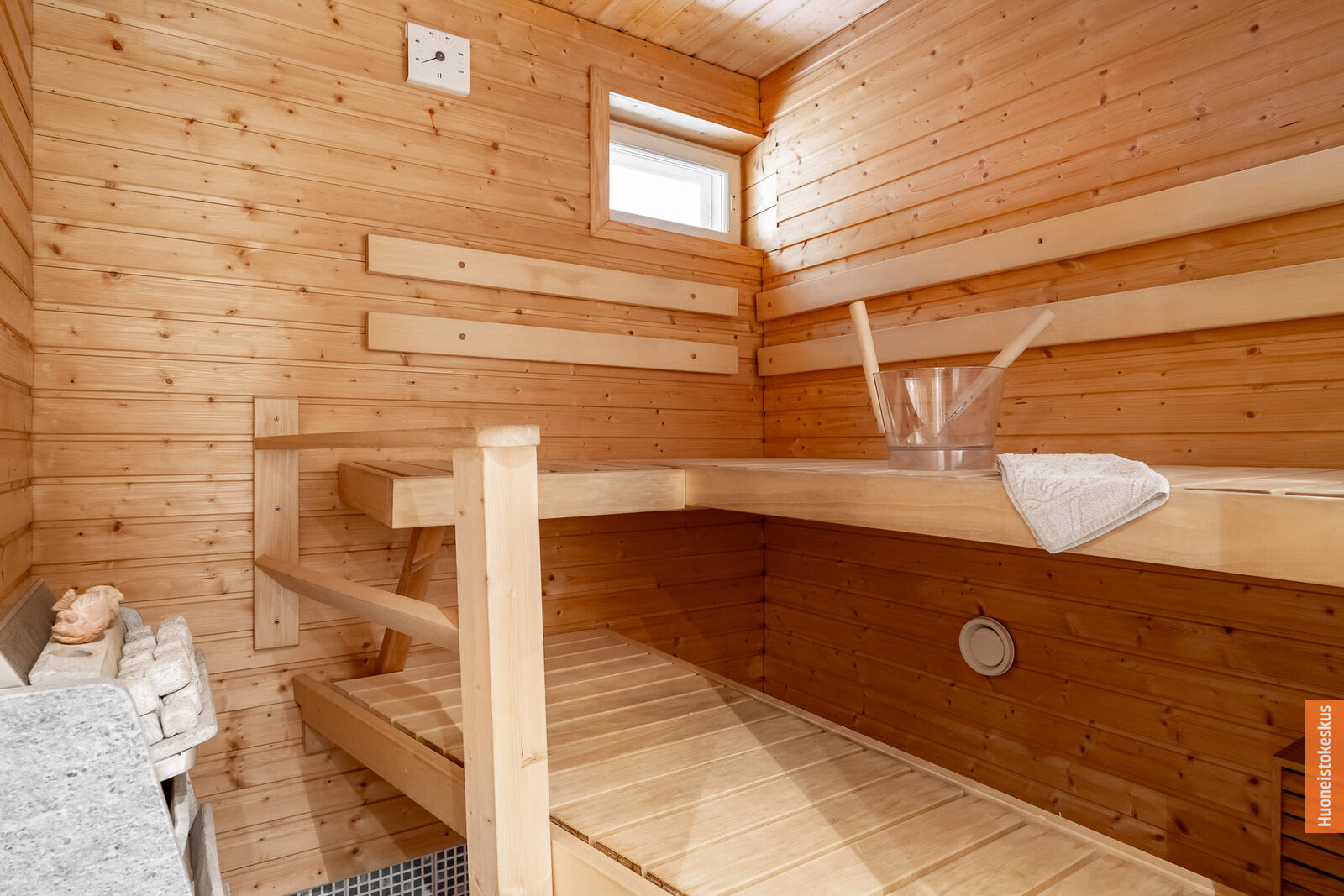 | Saunan kuvaus | Seinät (puu), lattiat (laatta), Sähkökiuas |