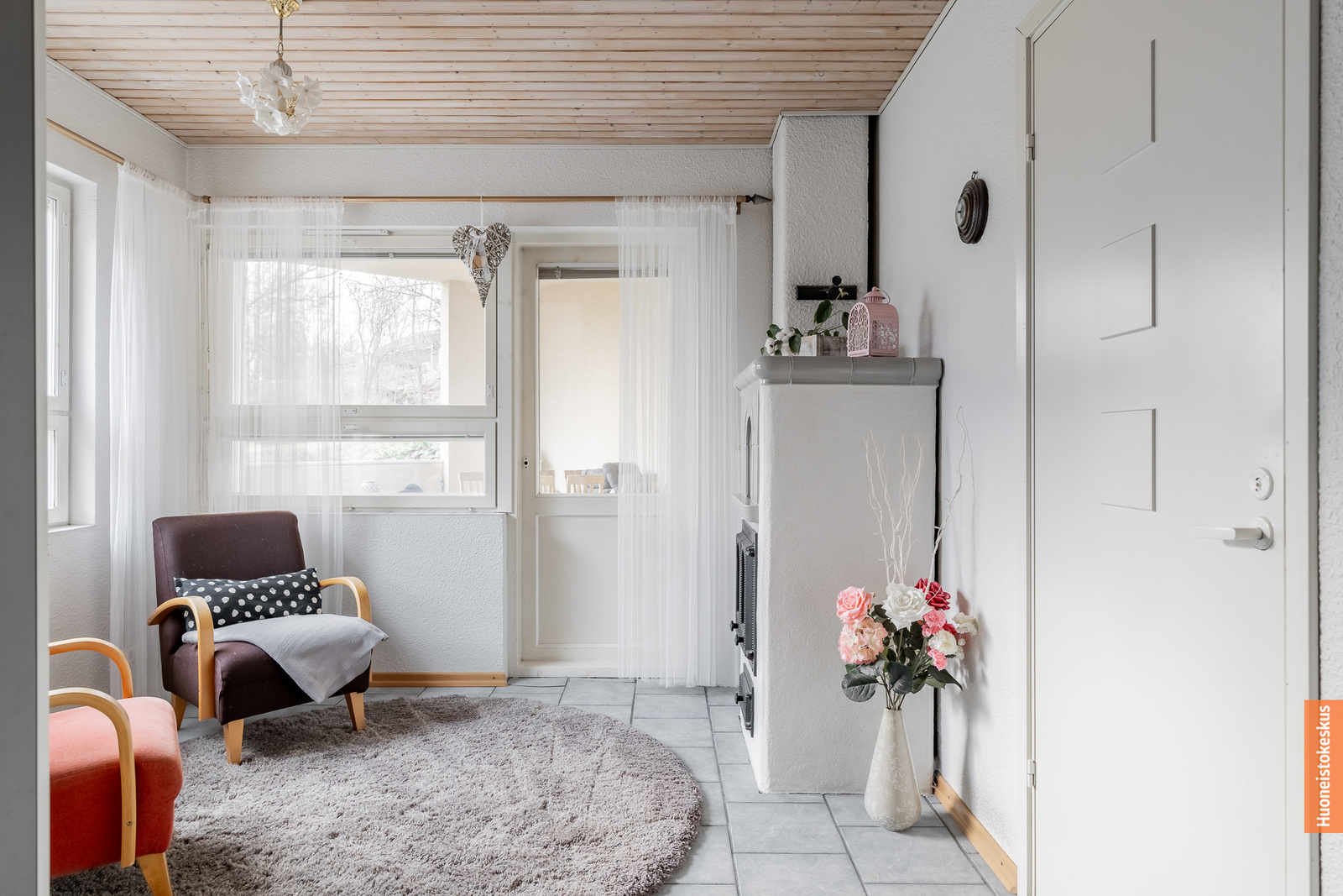 | Kodinhoitohuoneen kuvaus | Pöytätaso, pesuallas, pyykkikaapit, pesukoneliitäntä ja lattialämmitys, lattiat (laatta), seinät (kaakeli), Kodinhoitohuone alakerrassa. |