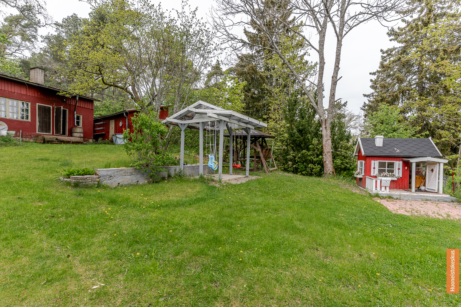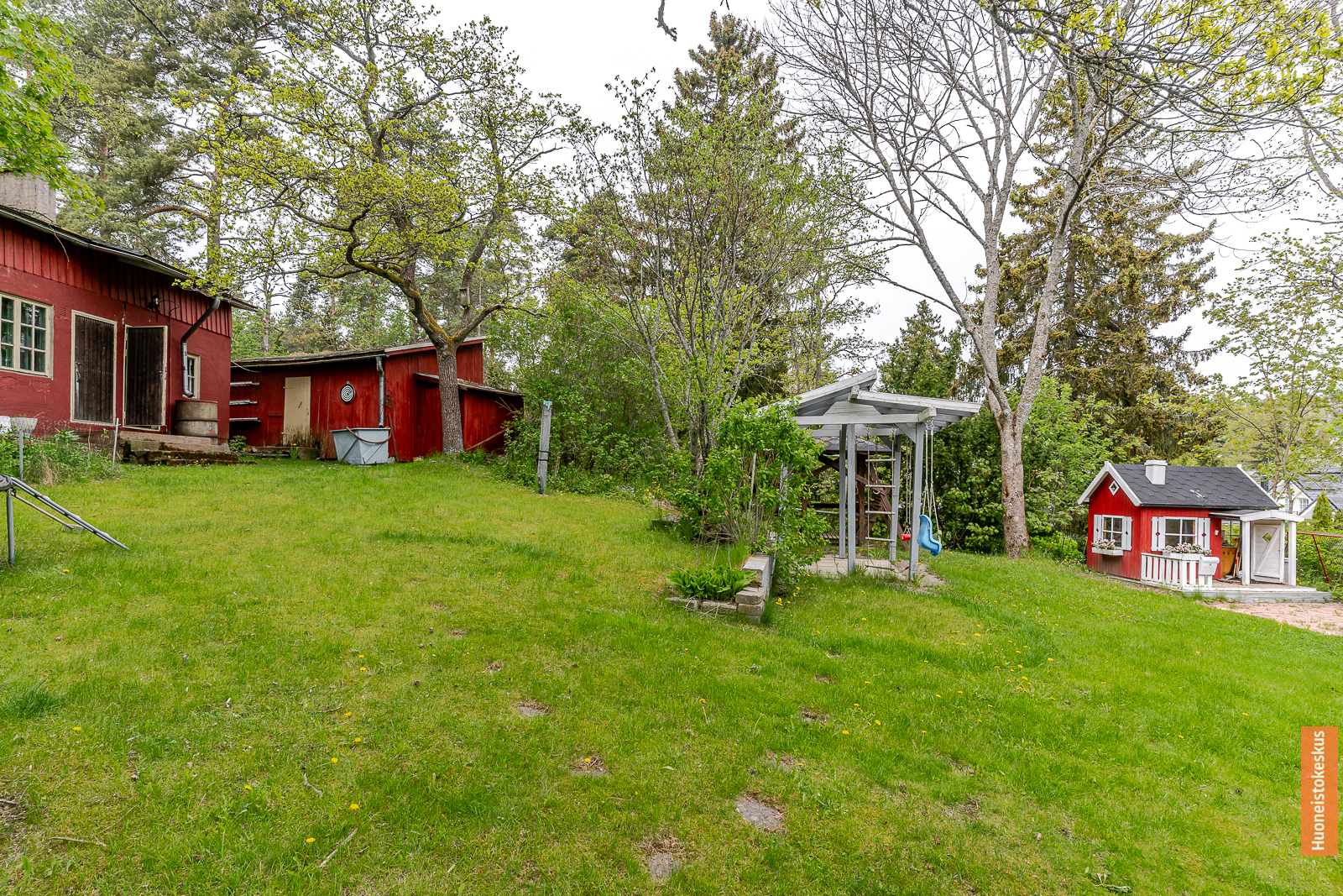 Pihan perältä löytyy ulkorakennus, jossa on kesähuone, ulkosauna ja vaja. Pienellä huolenpidolla nämä tilat heräävät eloon ja täydentävät pihapiirin mahdollisuudet. Lisäksi pihalta löytyy tunnelmallinen grillikatos, suloinen leikkimökki lapsille sekä käytännöllinen autotalli.