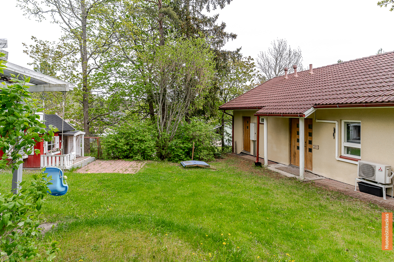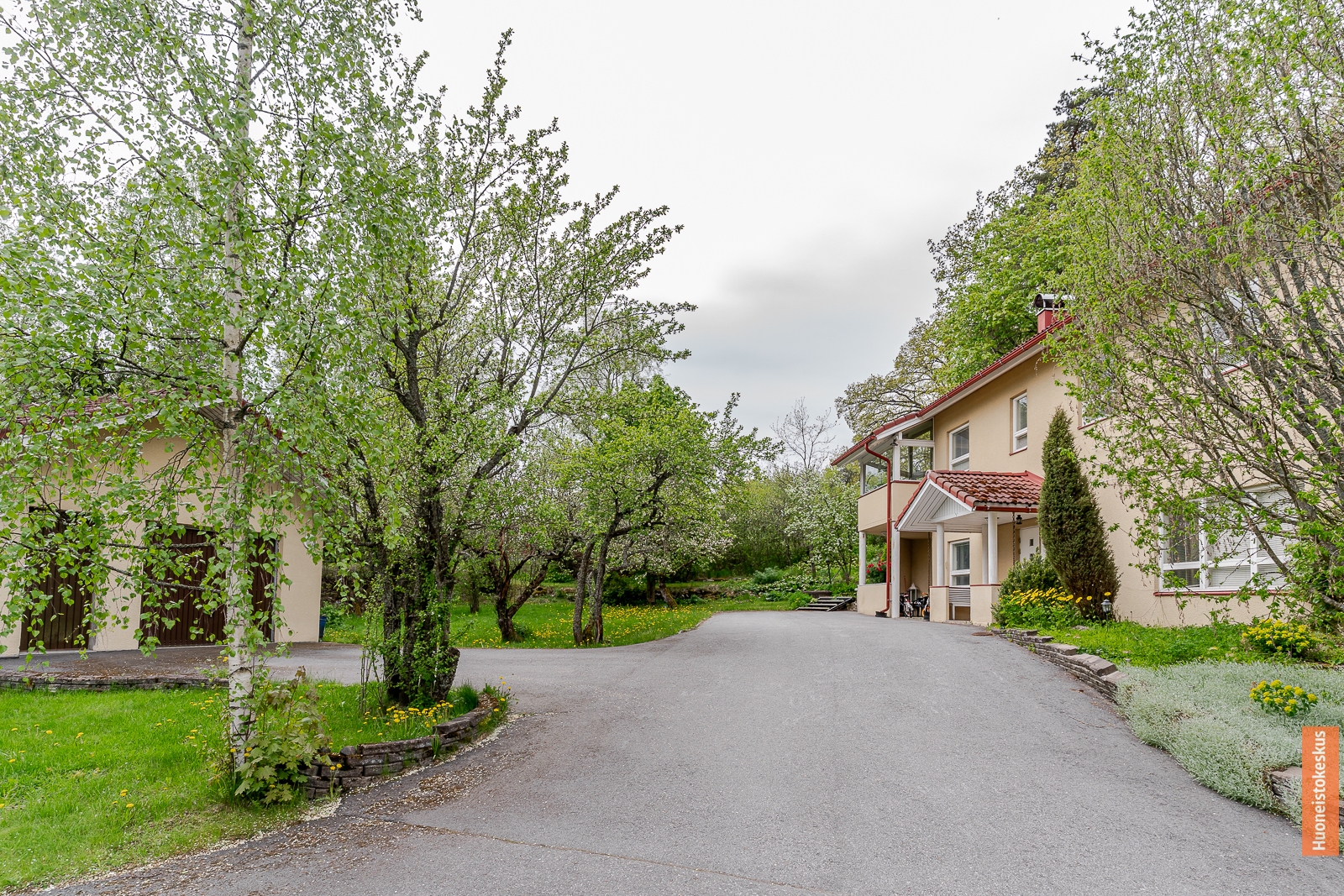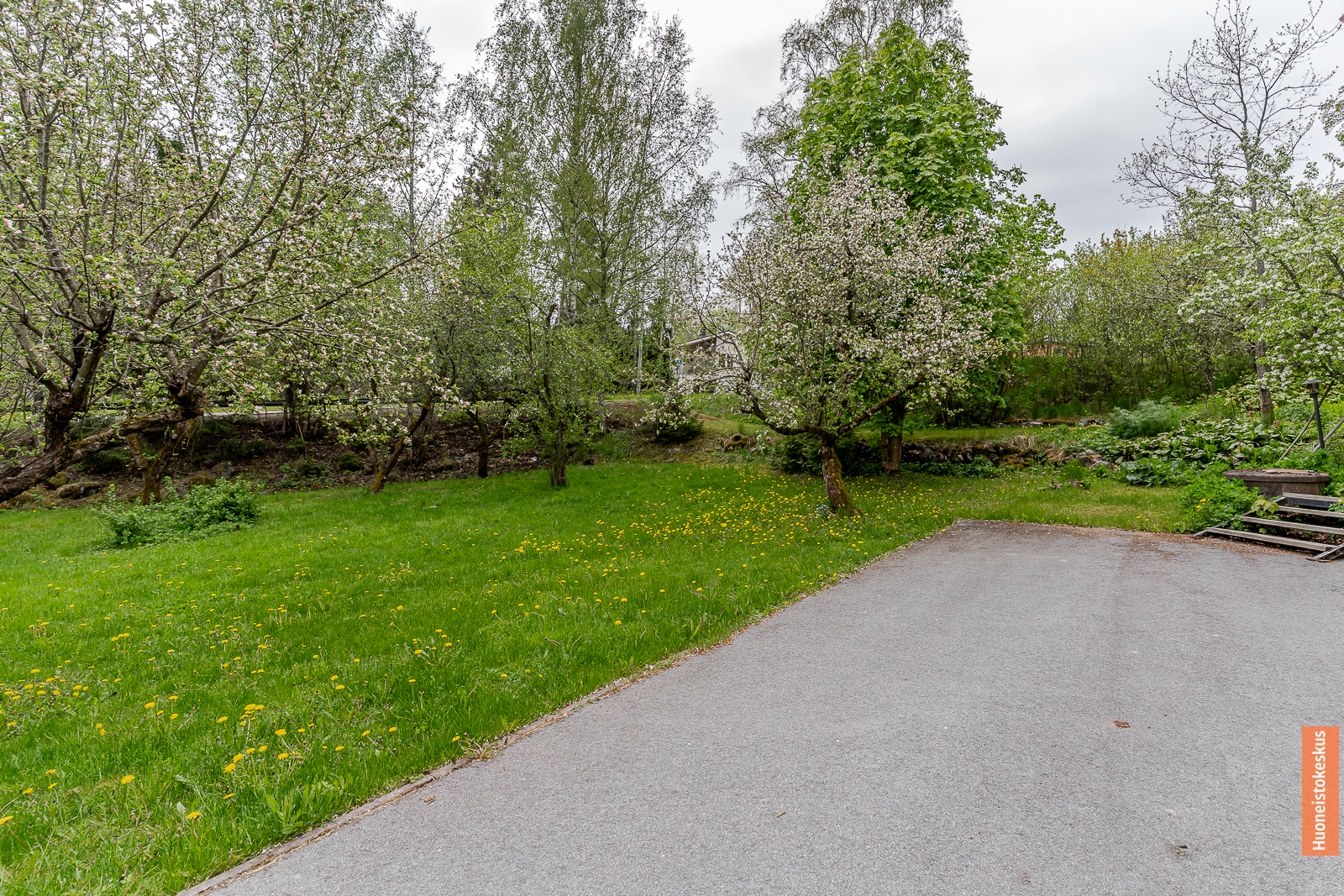 Talon ympäristö on kuin oma pieni keidas. Rinteeseen sijoittuva tontti tarjoaa ylä- ja alapihan, jotka molemmat on suunniteltu viihtyvyyttä silmällä pitäen. Pihalla kasvavat useat omena-, ja luumupuut, marjapensaat sekä kauniit kukkaistutukset, jotka tuovat vuodenaikojen vaihtelun näkyväksi omassa puutarhassa.