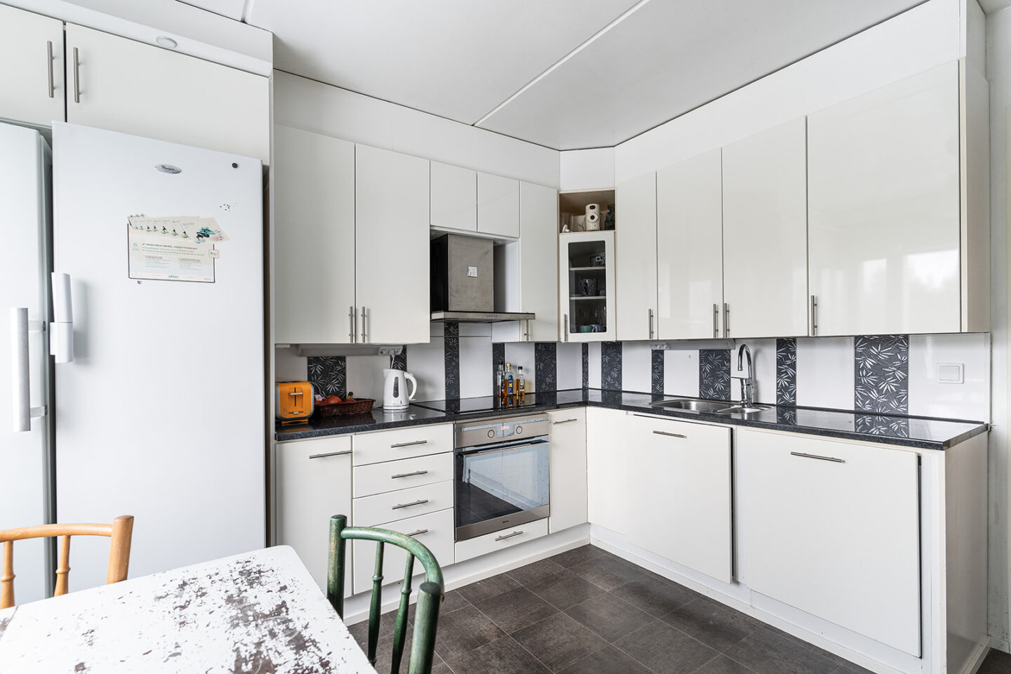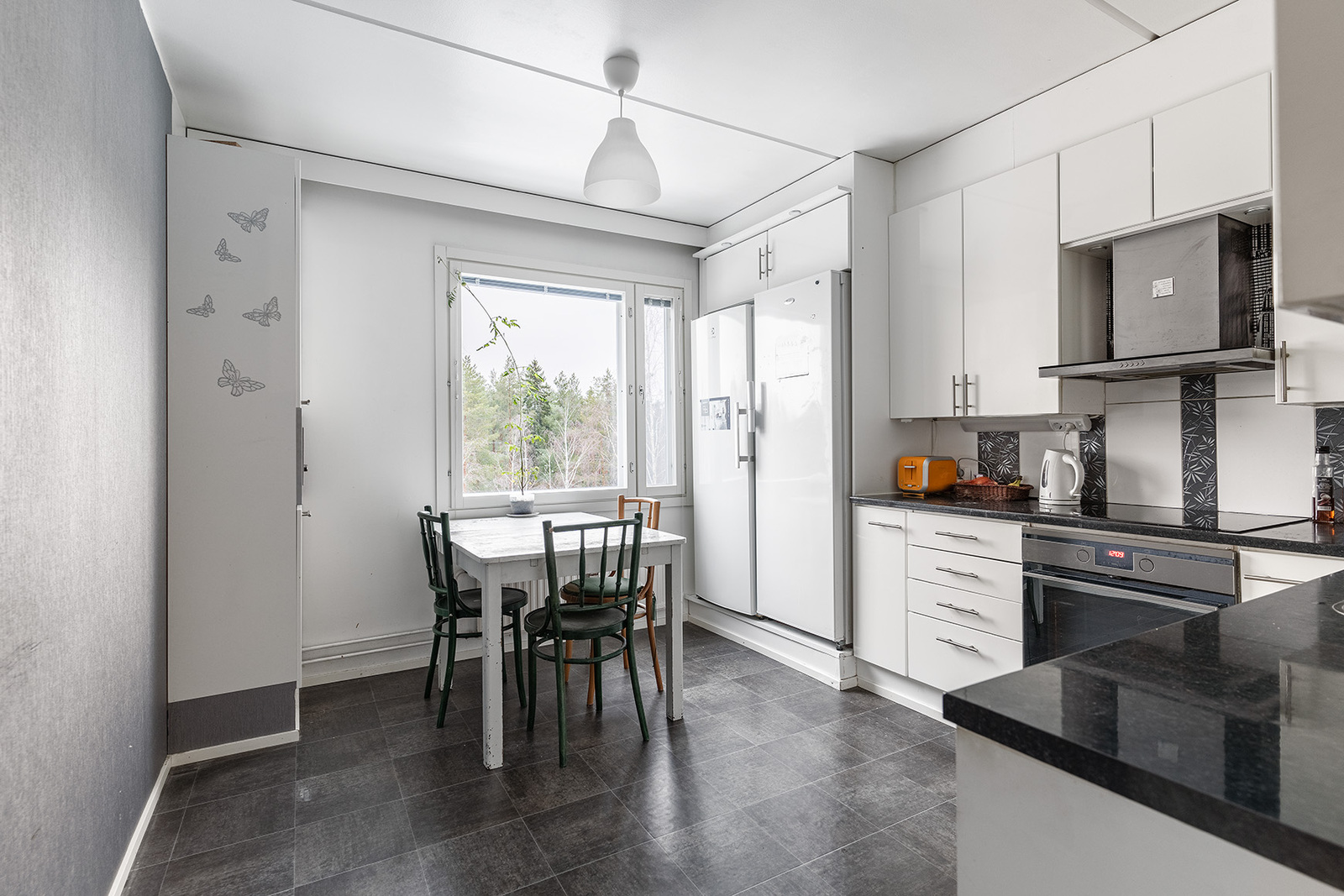 | Keittiön kuvaus | Liesi (erillisuuni, liesitaso), seinät (maali), lattiat (laminaatti), jääkaappi, erillisuuni, liesituuletin, erillinen pakastin, astianpesukone ja kiinteät valaisimet, liesitaso |