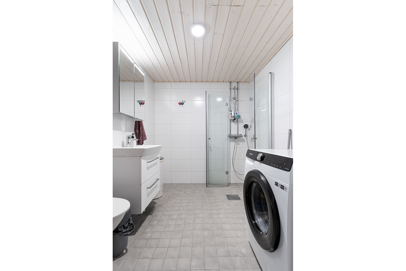 | Kylpyhuoneen kuvaus | Peilikaappi, suihkuseinä, suihku, pesukoneliitäntä ja kiinteät valaisimet, seinät (kaakeli), lattiat (laatta) |
