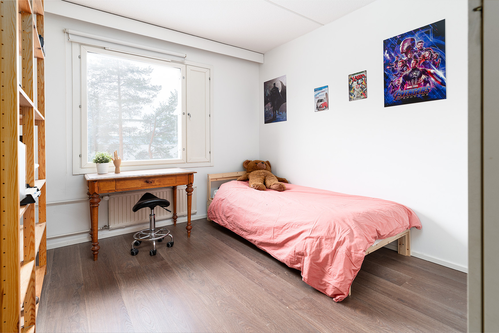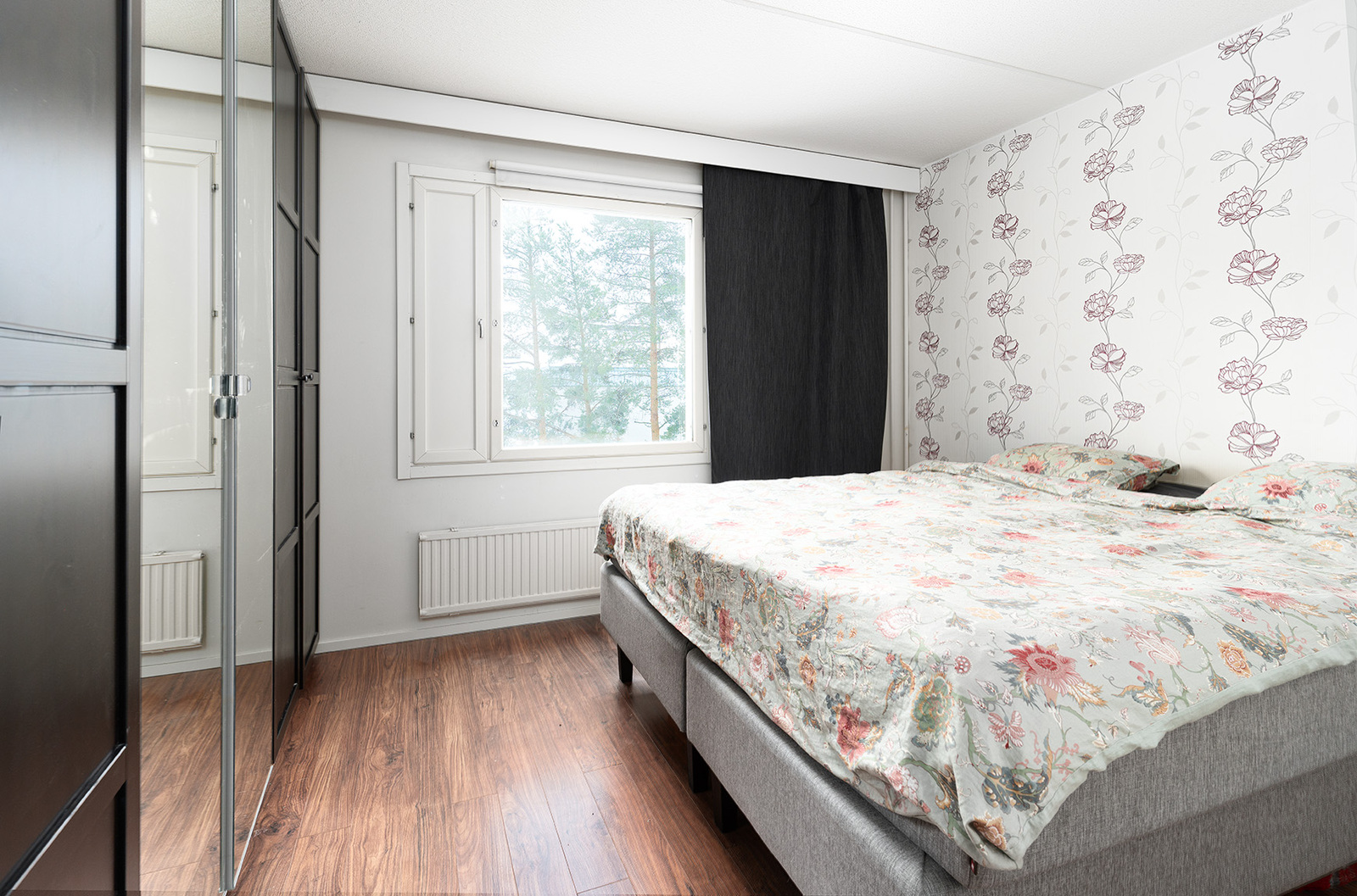 | Makuuhuoneen kuvaus | Lukumäärä: 3, seinät (tapetti ja maali), lattiat (laminaatti) |