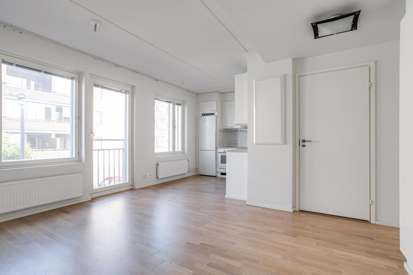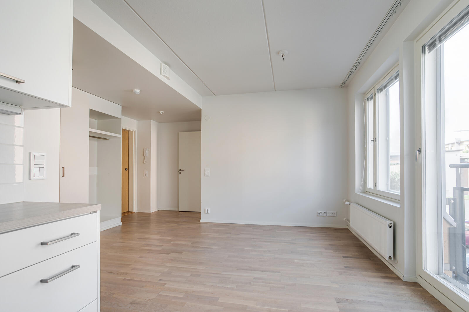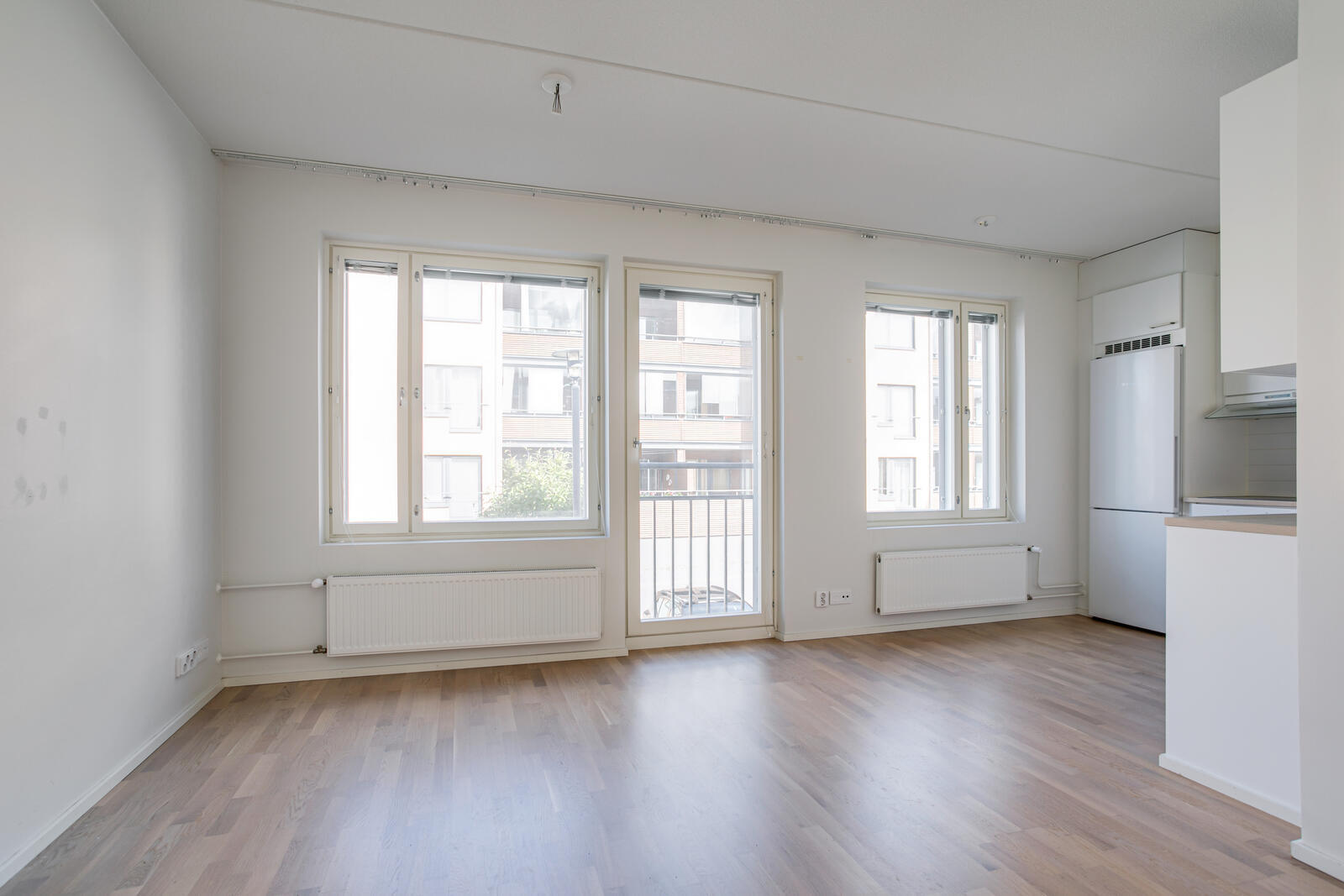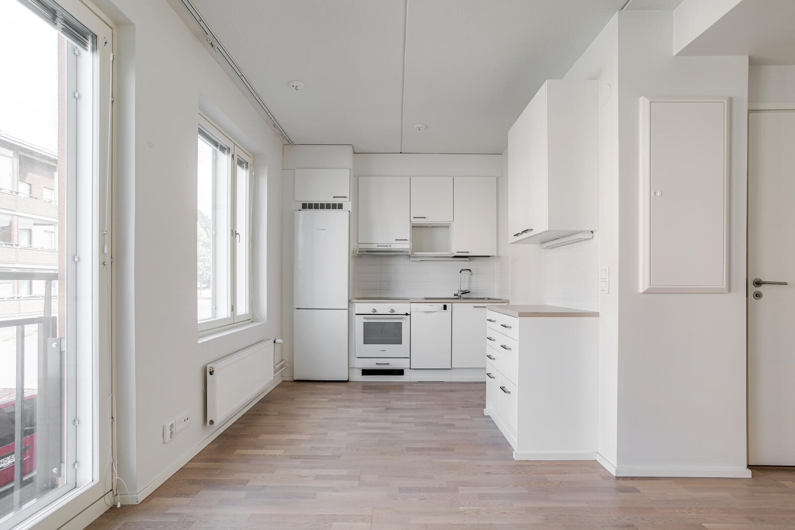 Yhtenäisessä keittiö-olohuoneessa on mukavasti tilaa oleskeluun ja ruokailuun. Huoneisto on valoisa, isot ikkunat sekä olo- että makuuhuoneessa.