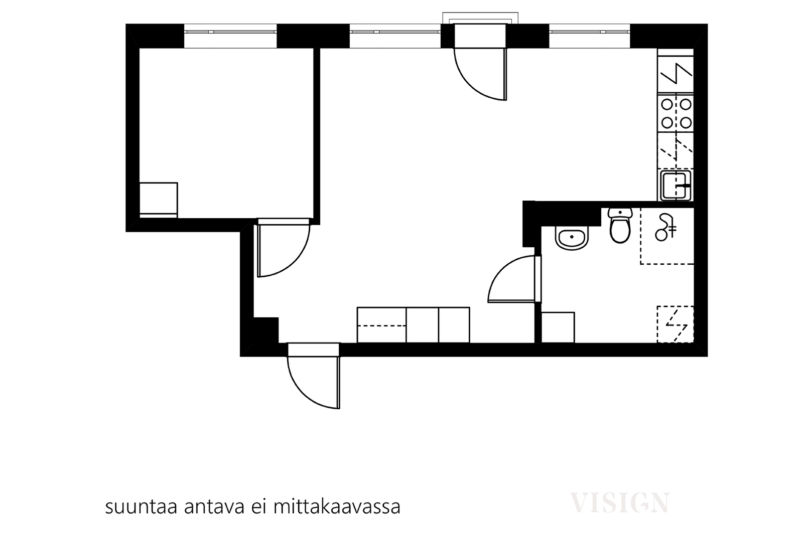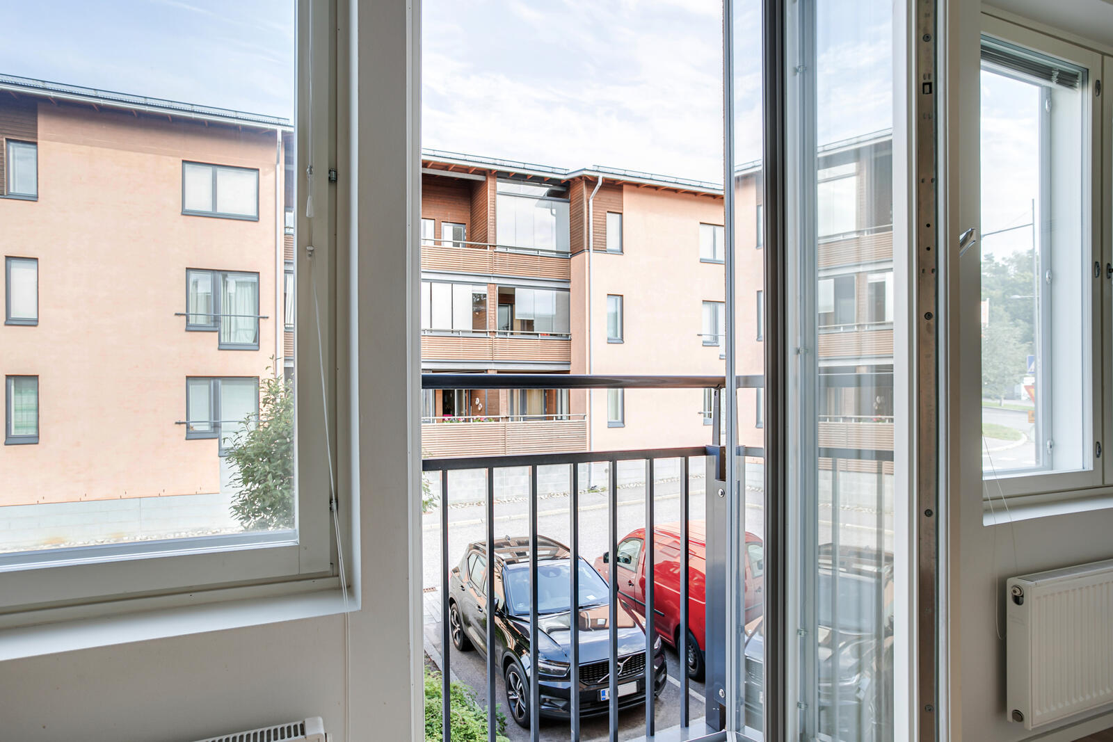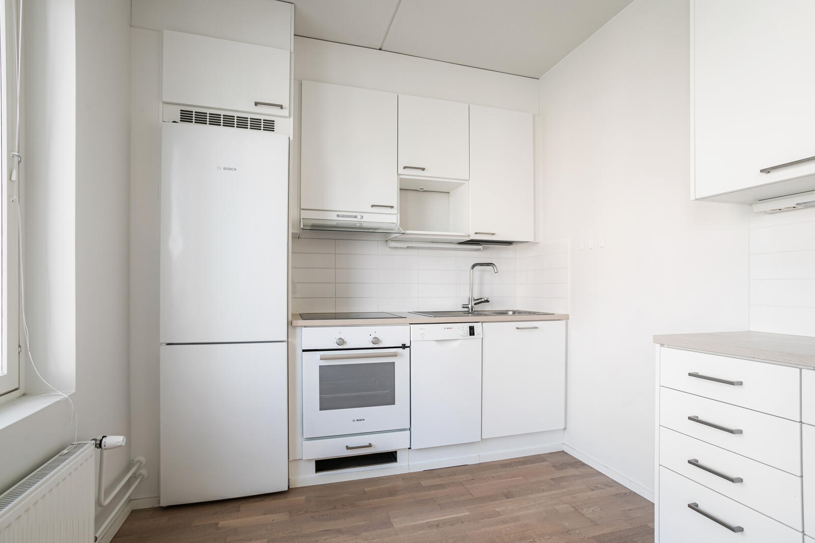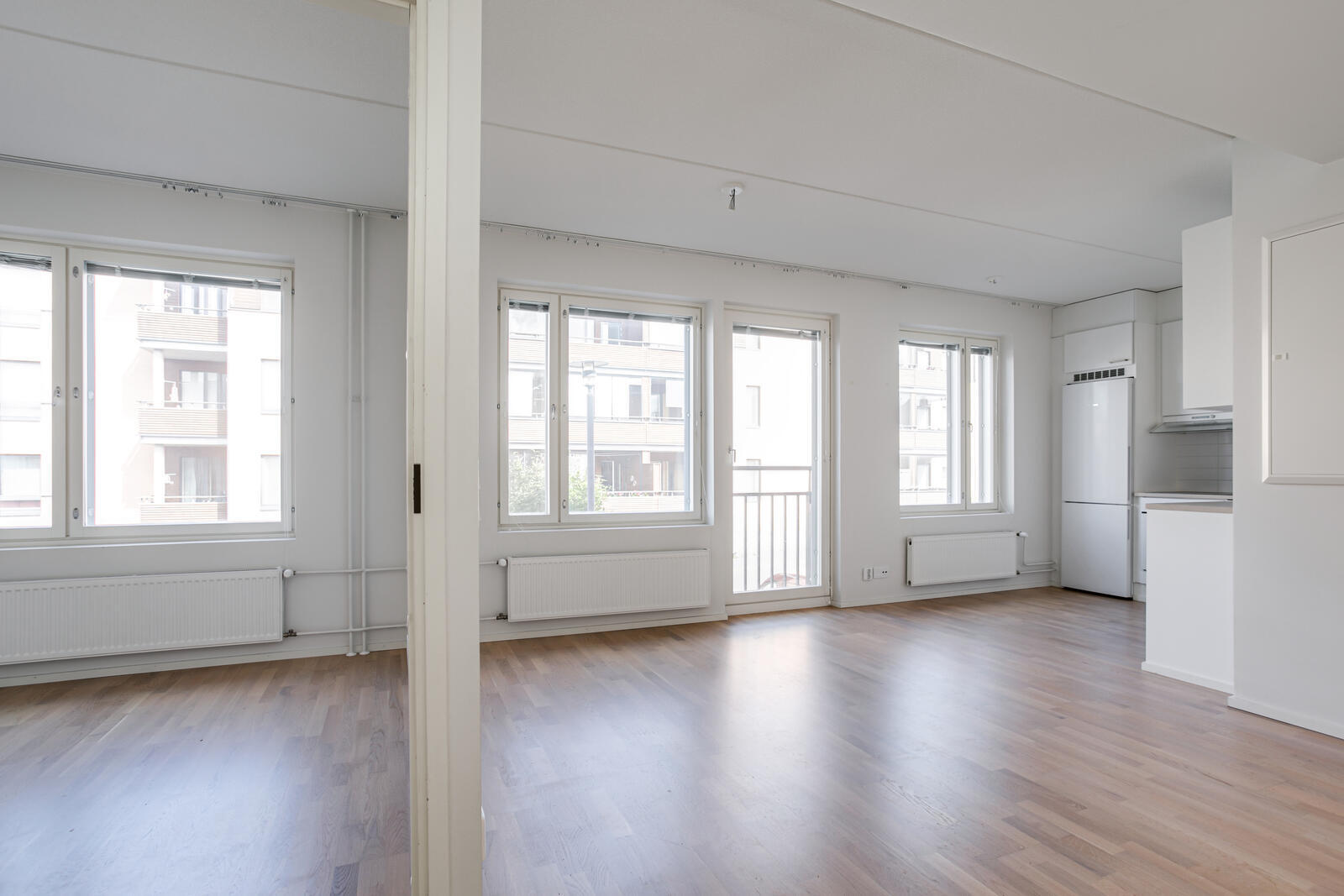 Yhtenäisessä keittiö-olohuoneessa on mukavasti tilaa oleskeluun ja ruokailuun. Huoneisto on valoisa, isot ikkunat sekä olo- että makuuhuoneessa.