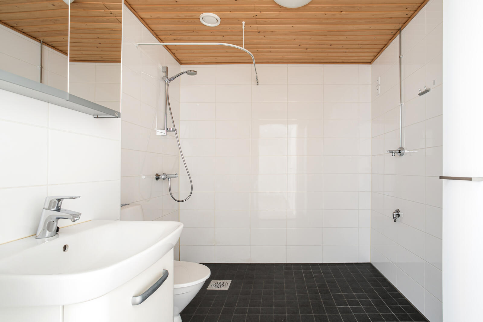 | Kylpyhuoneen kuvaus | Allaskaappi, suihku, wc-istuin, peilikaappi, pesukoneliitäntä ja kiinteät valaisimet, seinät (kaakeli), lattiat (laatta) |