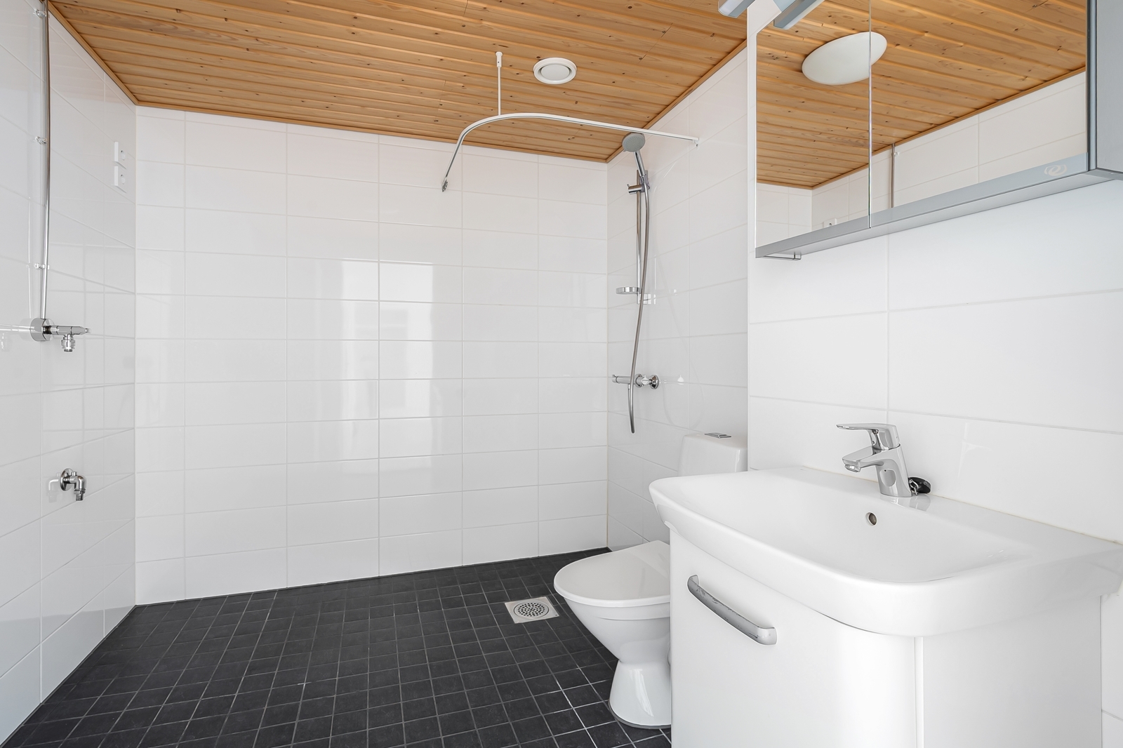 | Kylpyhuoneen kuvaus | Allaskaappi, pesukoneliitäntä, peilikaappi, wc-istuin, suihku ja kiinteät valaisimet, seinät (kaakeli), lattiat (laatta), bideesuihku, pesuallas, allaskaappi |