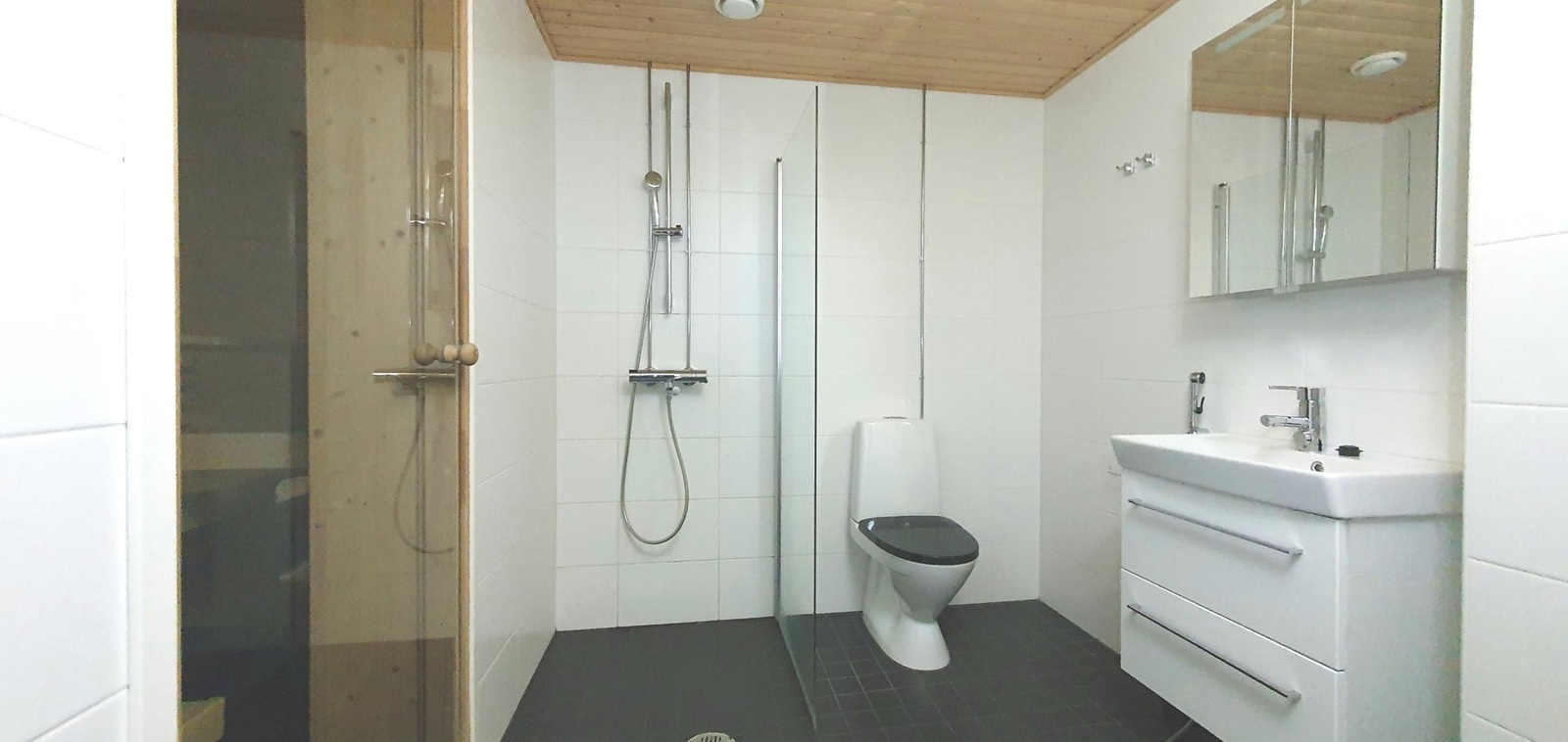 | Kylpyhuoneen kuvaus | Suihku, wc-istuin, pesukoneliitäntä, suihkuseinä, allaskaappi ja kiinteät valaisimet, seinät (kaakeli), lattiat (laatta) |