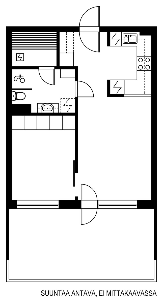 Asunnon olohuone on tilava ja sen yhteydessä on hyvänkokoinen avokeittiö sekä osittain katettu terassipiha, joka on tarvittaessa mahdollista lasittaa katetun tilan osalta. Makuuhuoneessa on hyvin kaappitilaa ja liukuovi säästää mukavasti tilaa. Kylpyhuone on mukavan väljä ja tilaa pyykinpesukoneellekin on valmiina. Lisäksi sen yhteydessä on oma sauna.