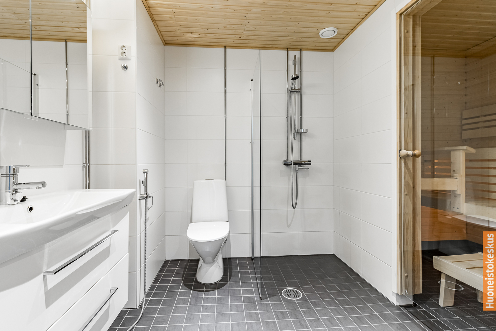 | Kylpyhuoneen kuvaus | Suihkuseinä, lattialämmitys, suihku, pesukoneliitäntä, wc-istuin, allaskaappi ja kiinteät valaisimet, seinät (kaakeli), lattiat (laatta) |