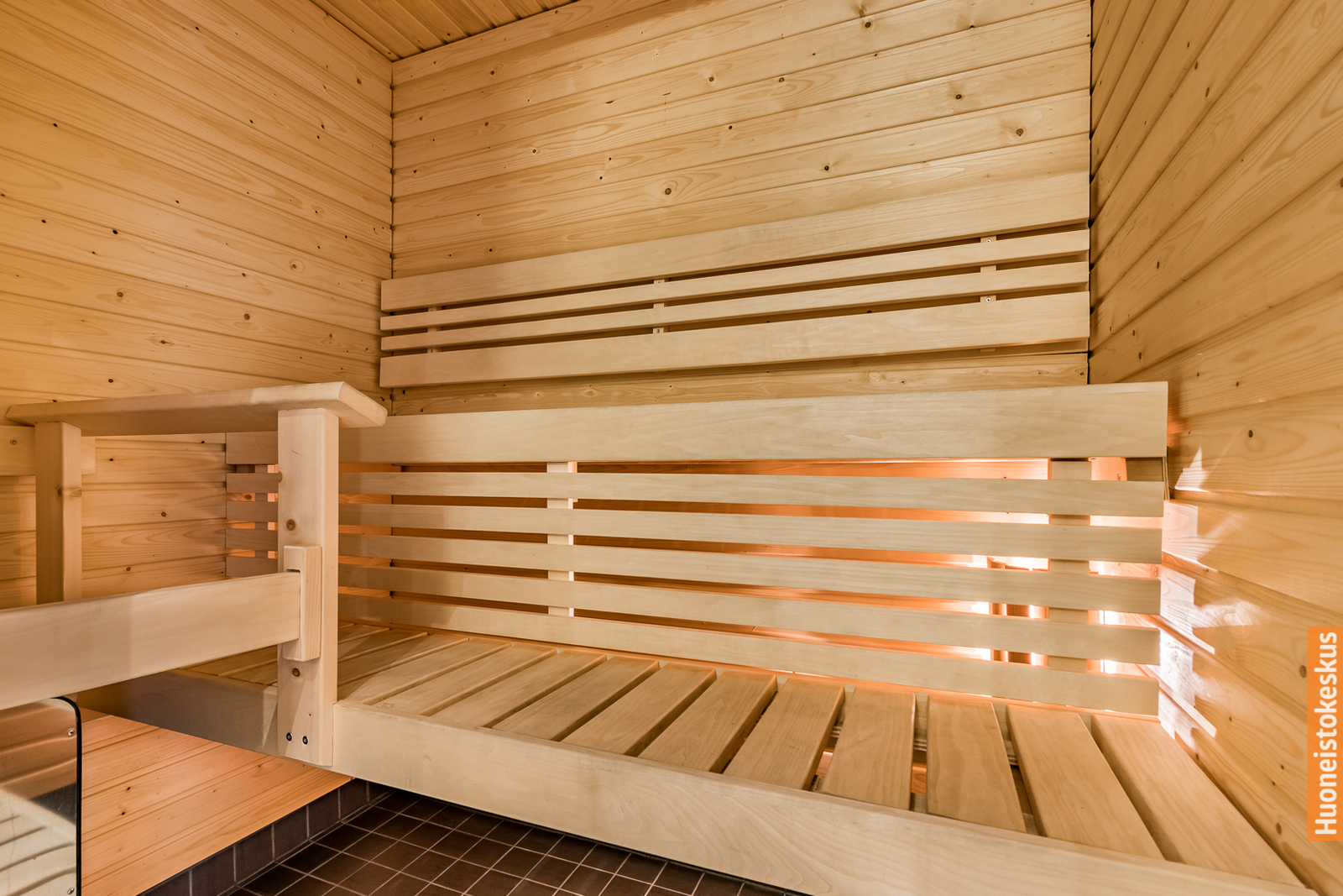 | Saunan kuvaus | Seinät (puu), lattiat (laatta), Sähkökiuas |