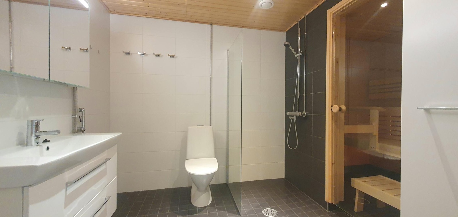| Saunan kuvaus | Seinät (kaakeli), lattiat (laatta), Sähkökiuas |