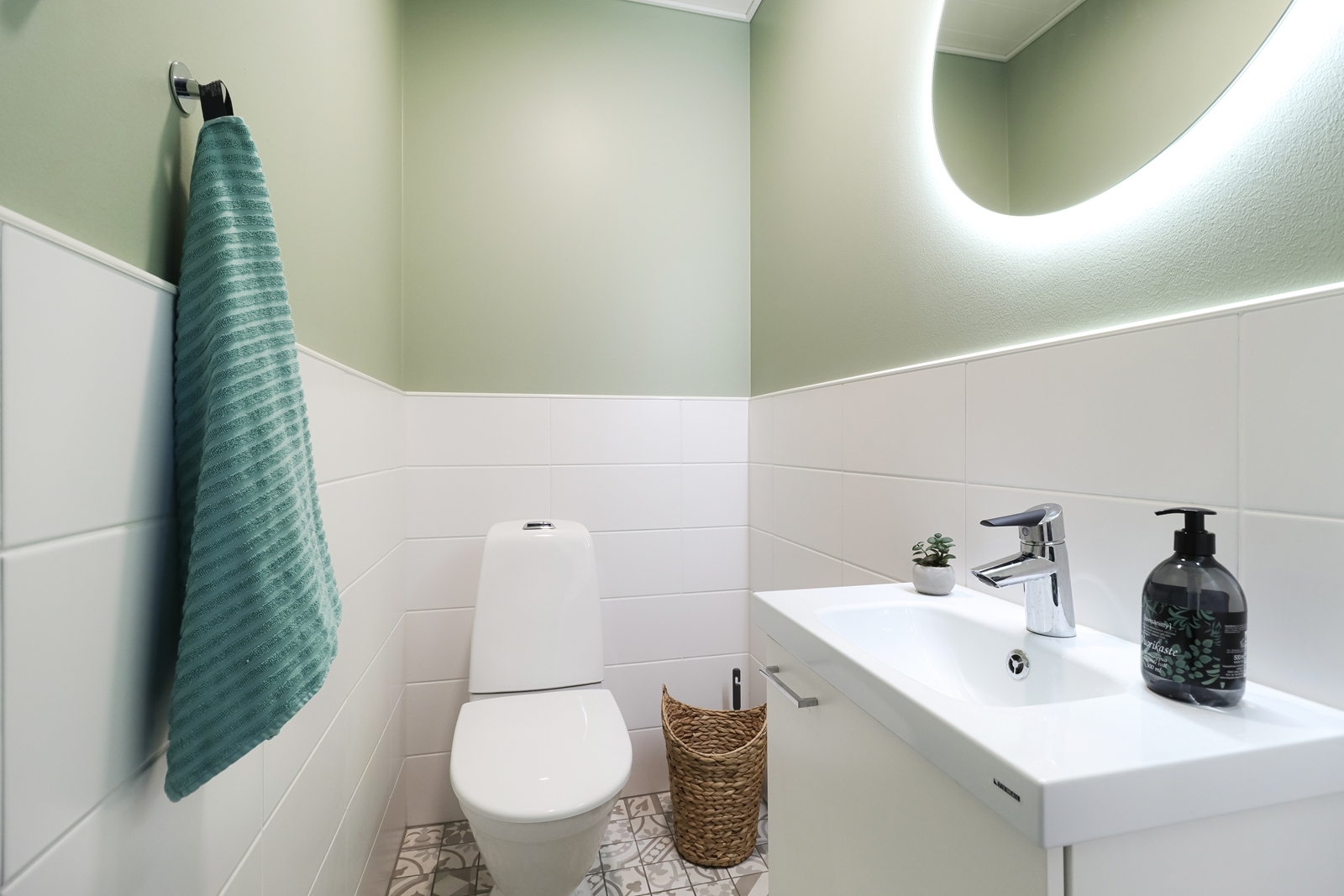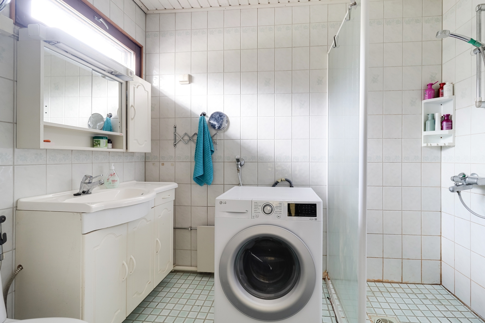 | Kylpyhuoneen kuvaus | Suihkuseinä, suihku, wc-istuin, allaskaappi, pesukoneliitäntä ja kiinteät valaisimet, lattiat (laatta) |