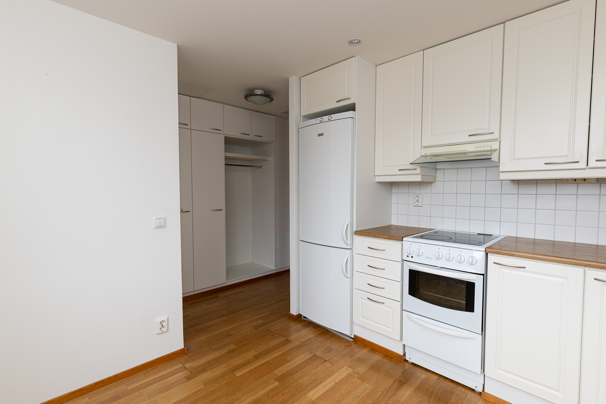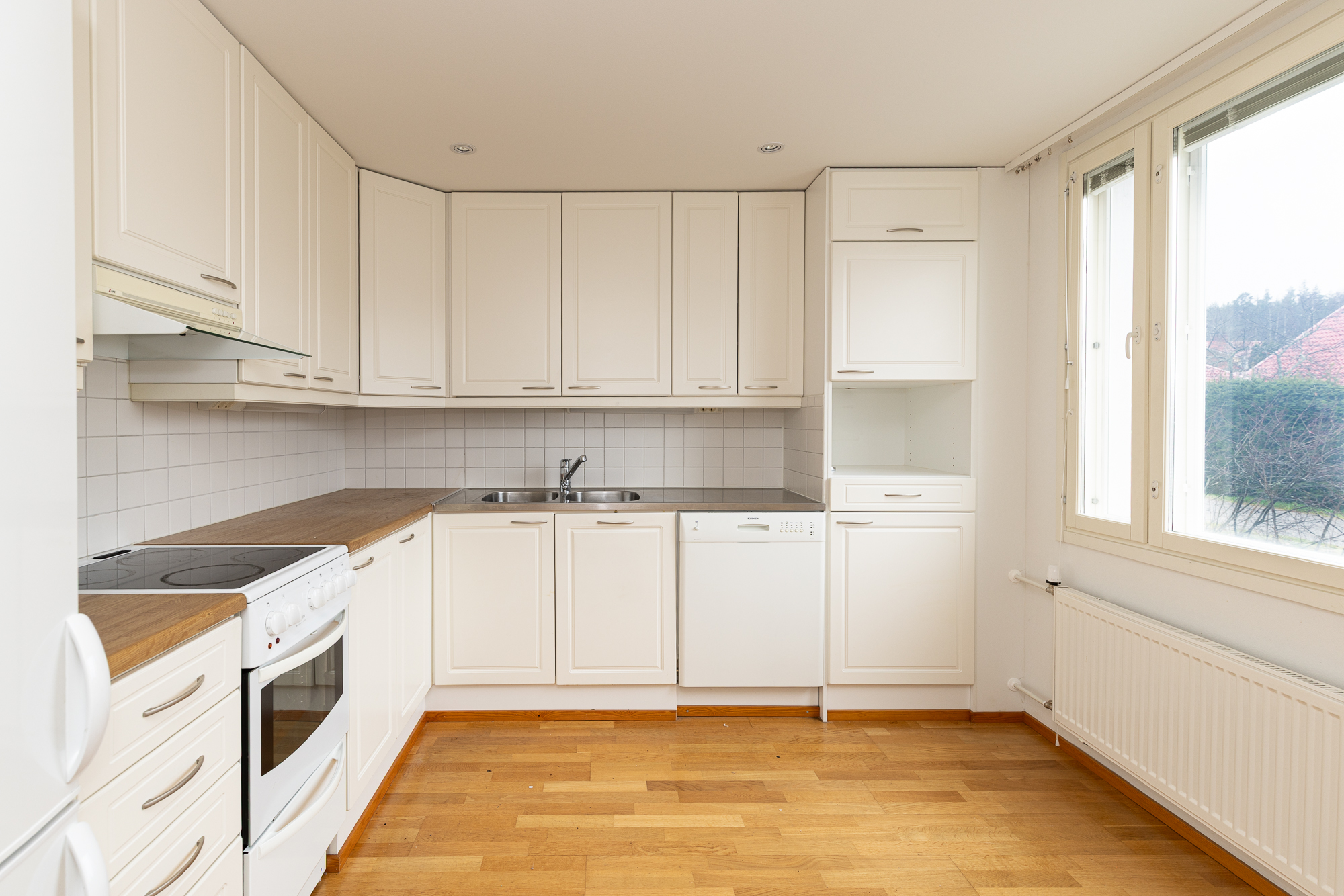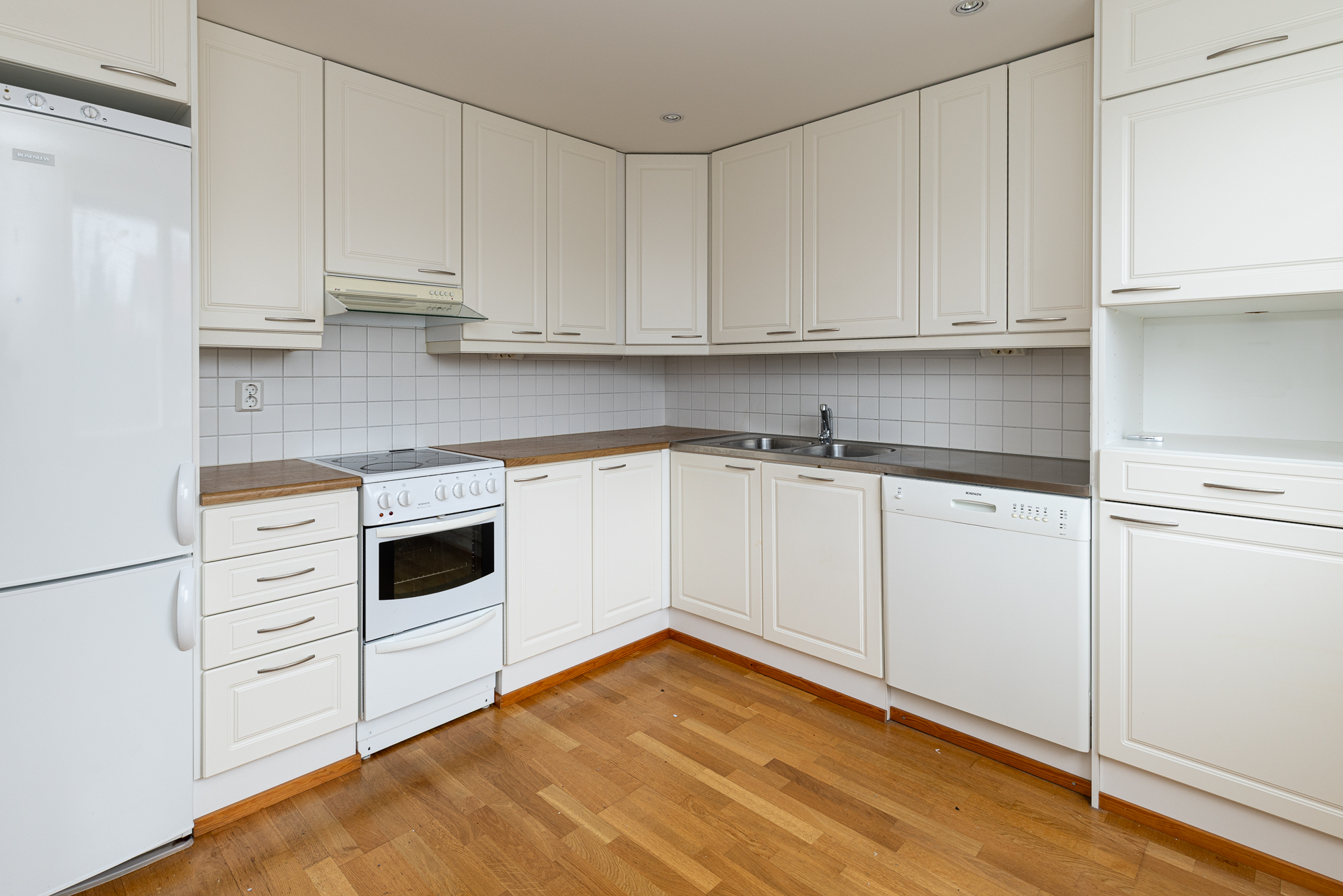 | Keittiön kuvaus | Liesi (Keraaminen liesi), työtasot (laminaatti), seinät (maali), lattiat (parketti), jääkaappipakastin, liesi, liesituuletin ja astianpesukone |