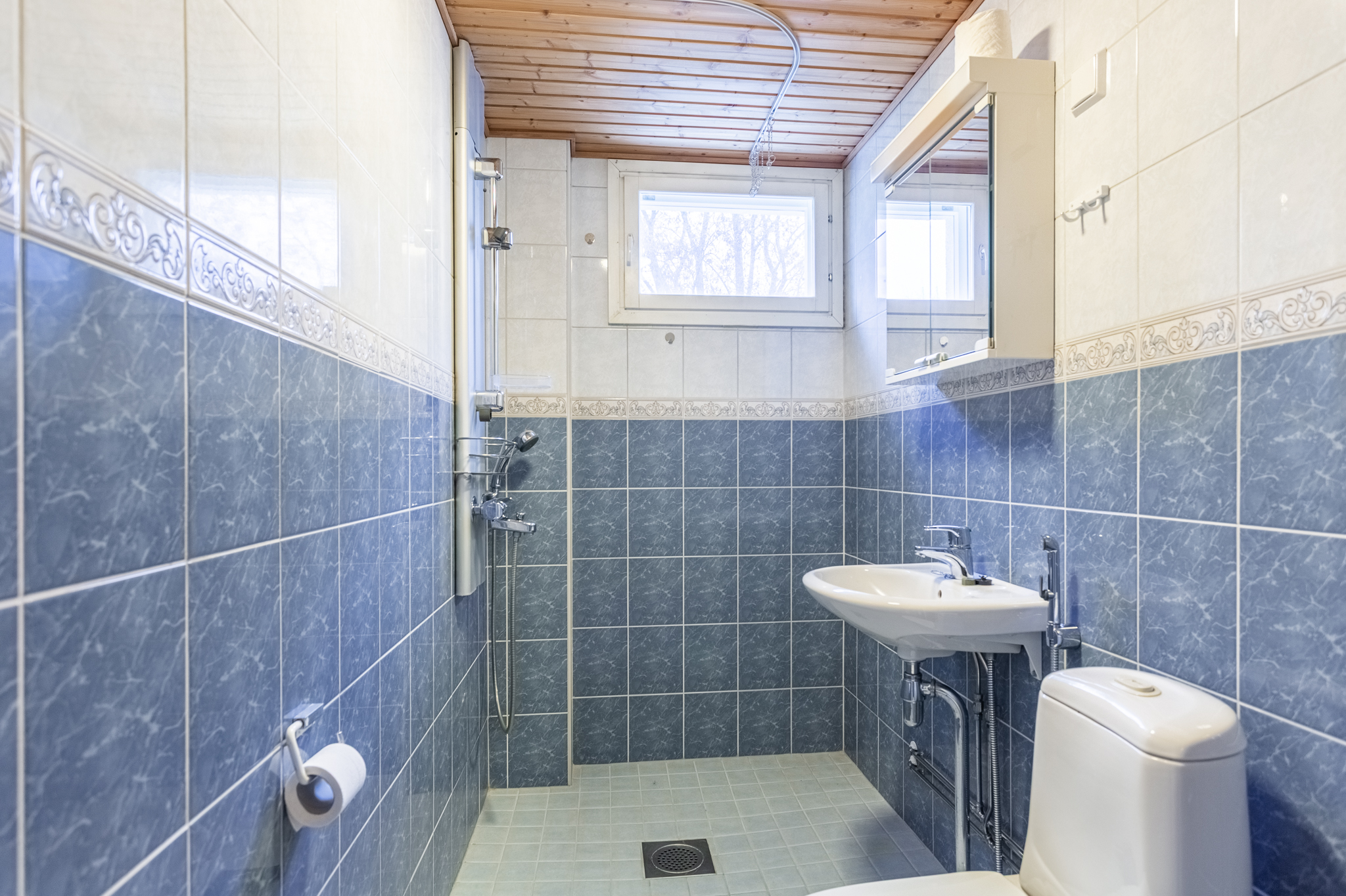 | Kylpyhuoneen kuvaus | WC-istuin, suihku, pesukoneliitäntä, lattialämmitys, peilikaappi ja pesuallas, seinät (kaakeli), lattiat (laatta) |