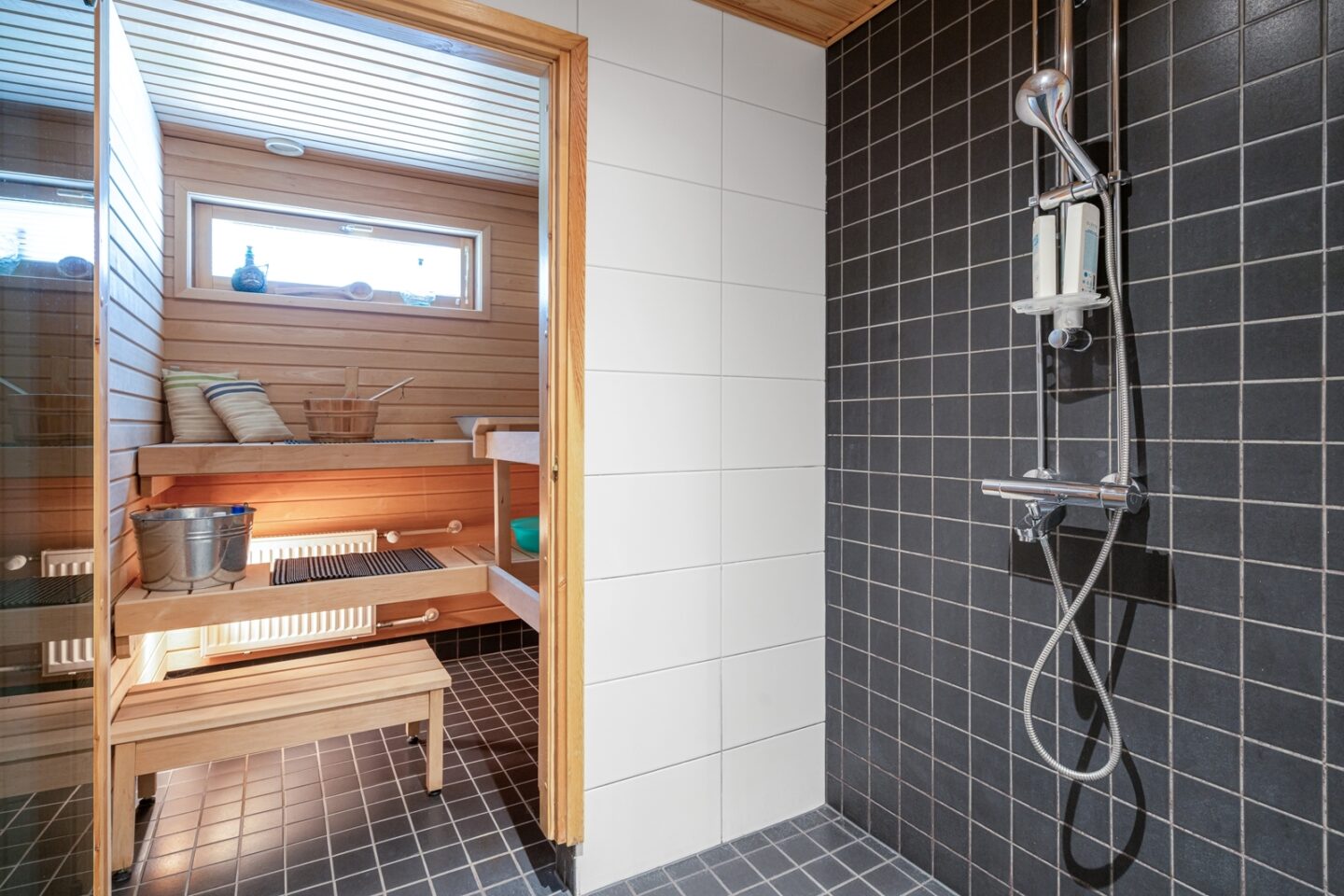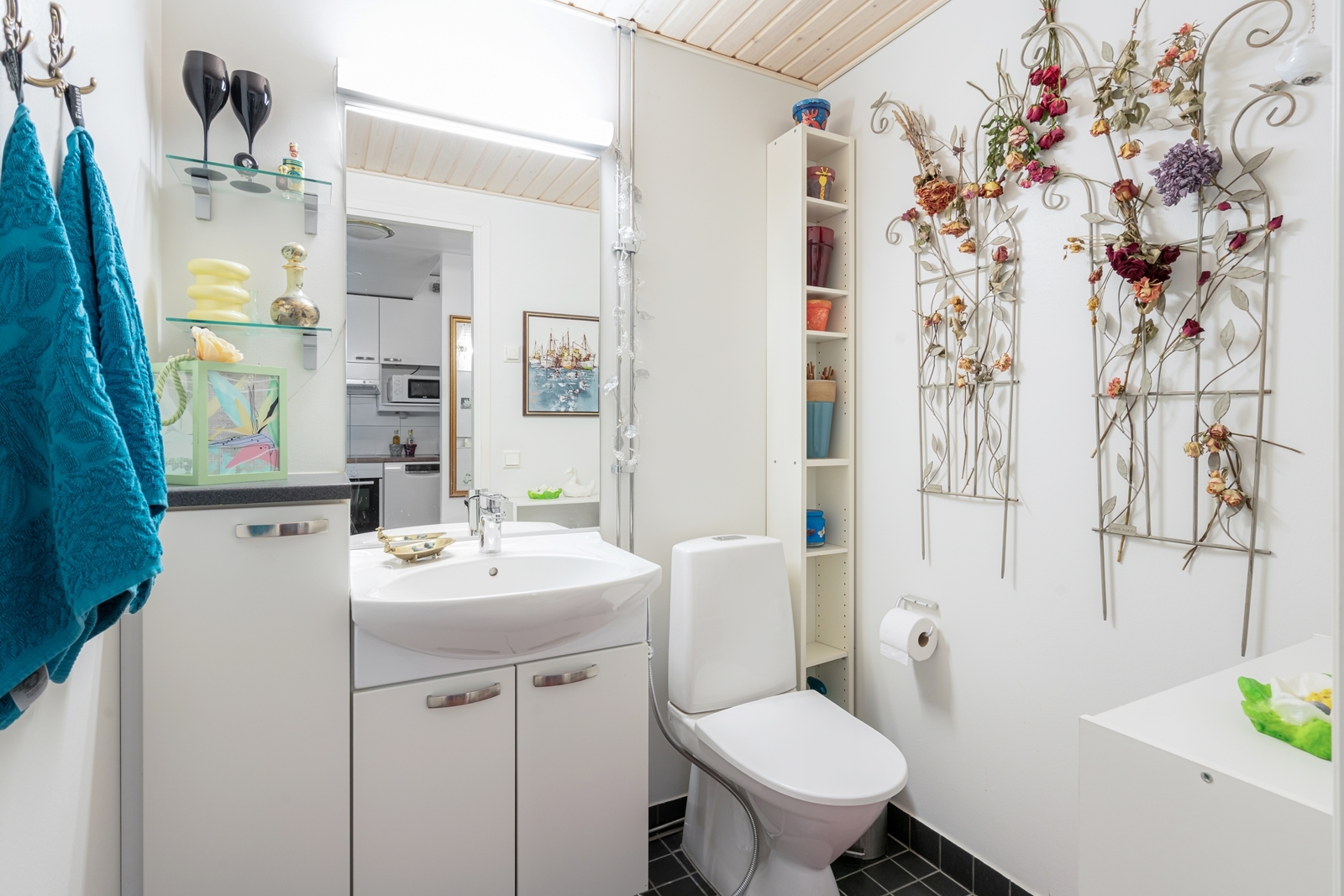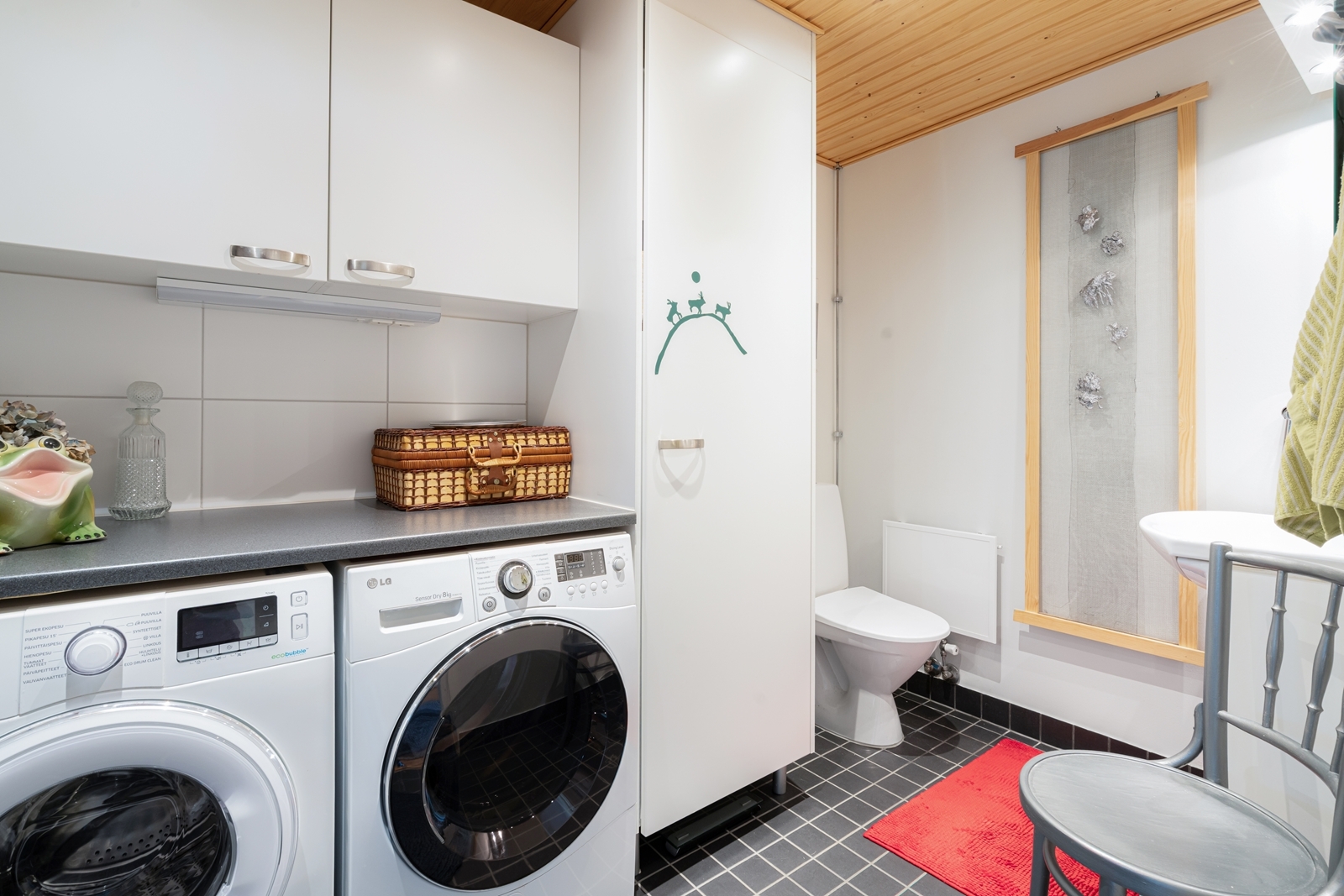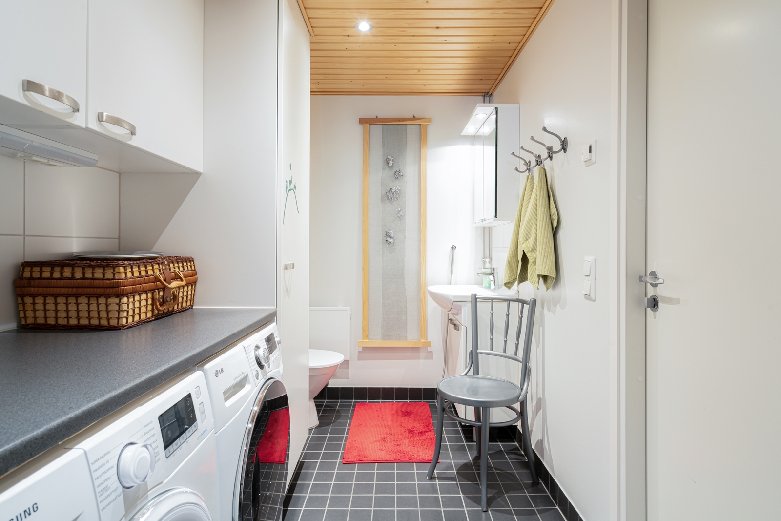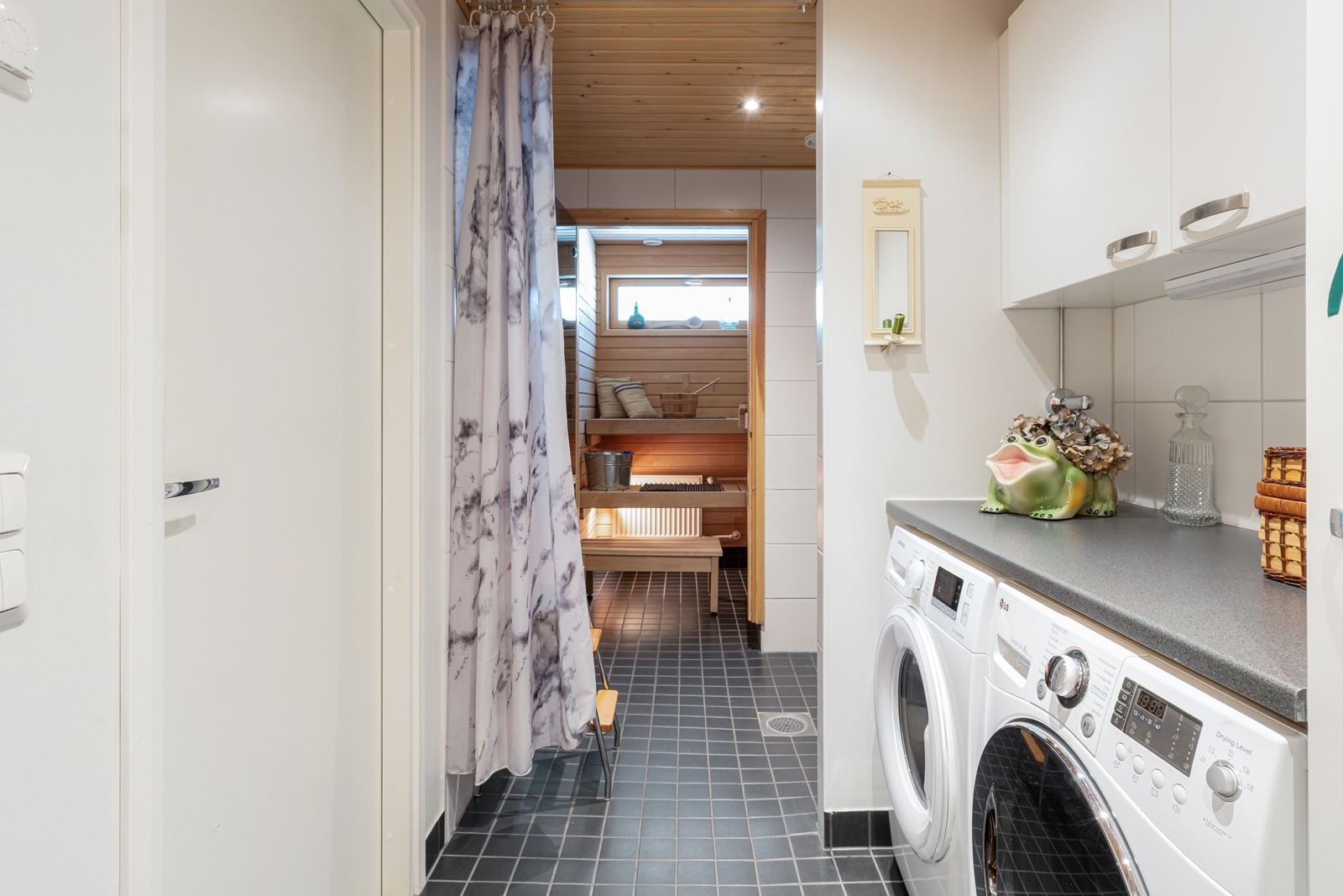 Suihku, pesukoneliitäntä ja lattialämmitys, seinät (maali ja kaakeli), lattiat (laatta) |