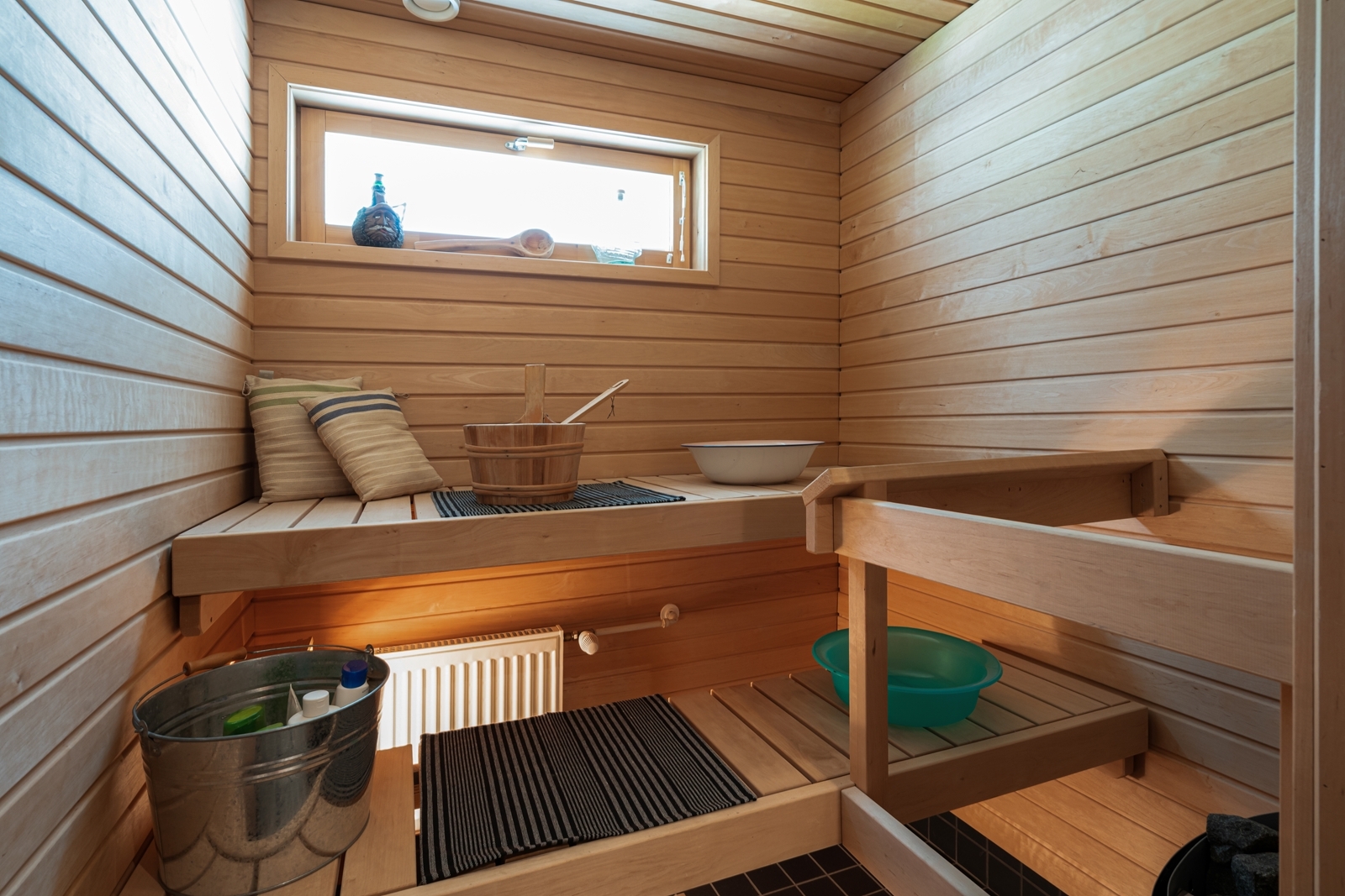 Seinät (puu), lattiat (laatta), Sähkökiuas, Uusi kiuas. |