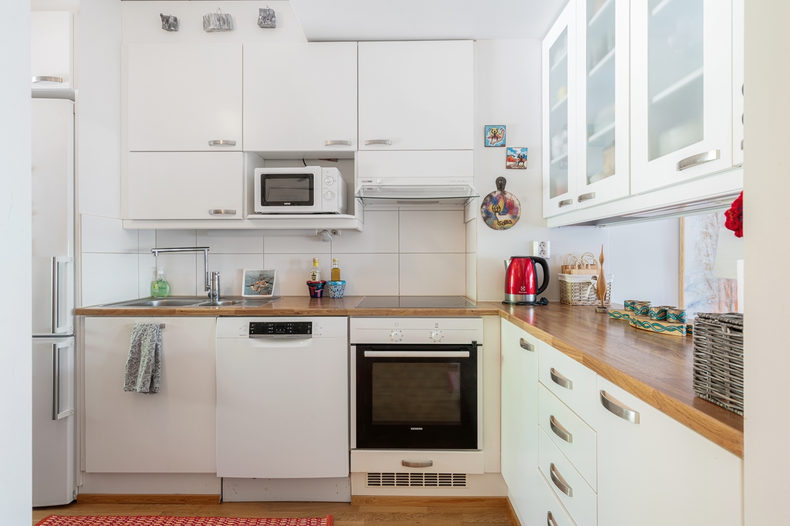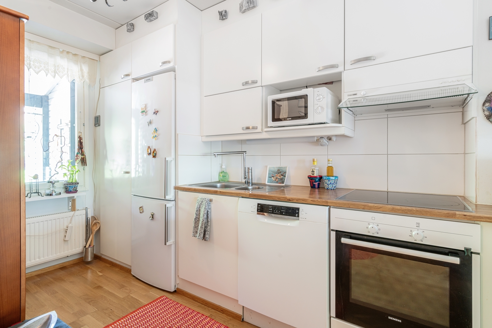 Liesi (Keraaminen liesi ja erillisuuni), lattiat (parketti), astianpesukone, erillisuuni, jääkaappipakastin ja liesituuletin |