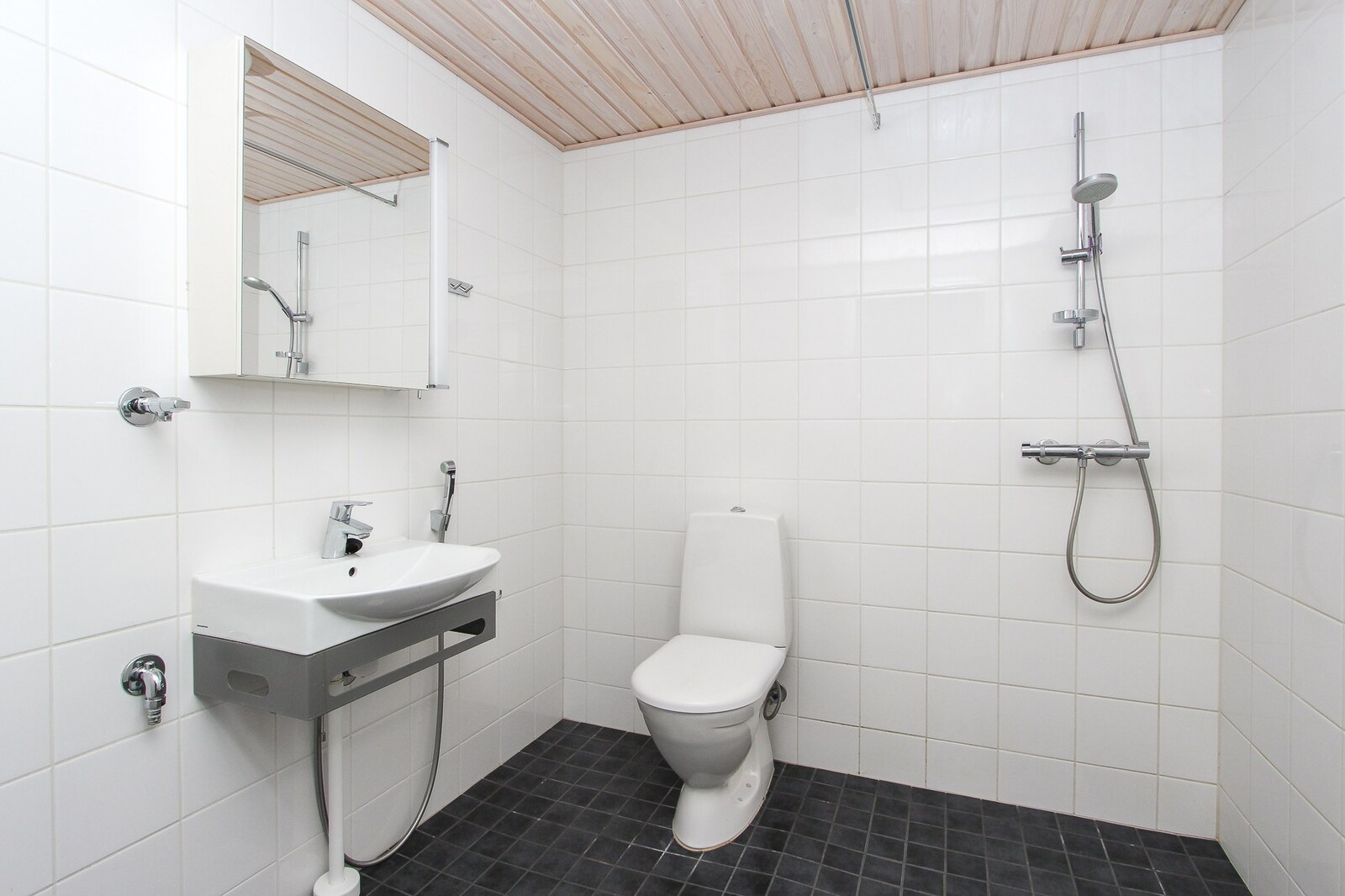 Pesukoneliitäntä, lattialämmitys, peilikaappi, wc-istuin, suihku ja kiinteät valaisimet, seinät (kaakeli), lattiat (laatta) |