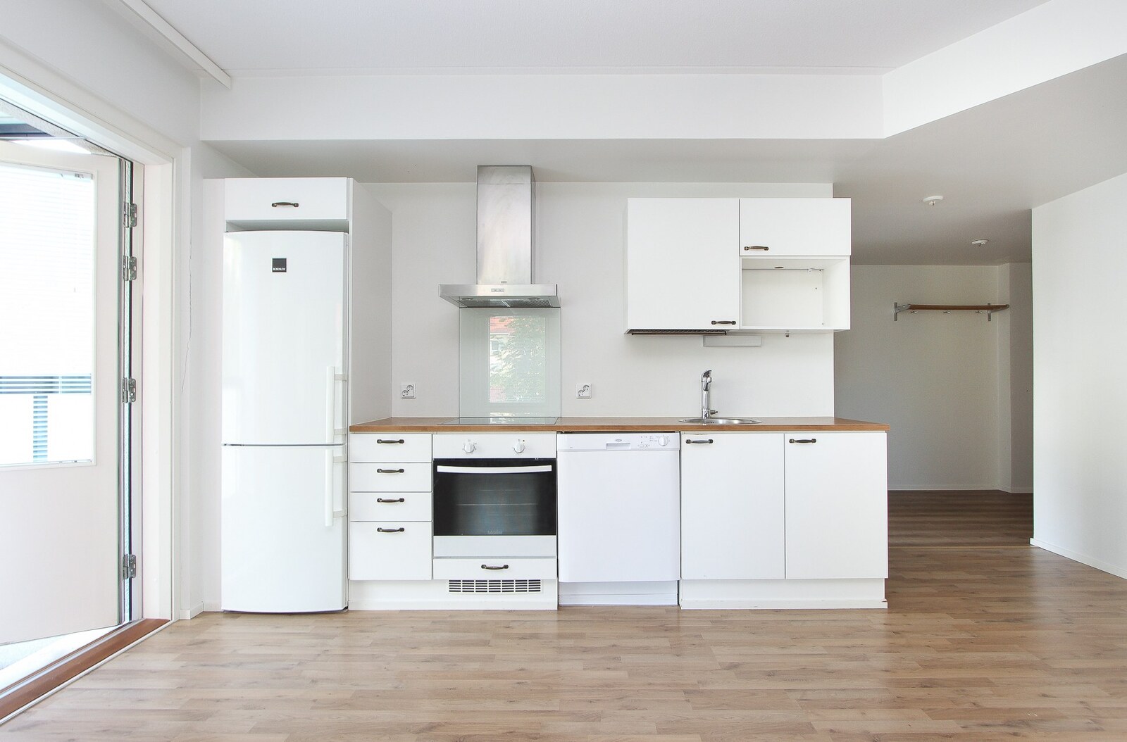 Liesi (Induktioliesi ja erillisuuni), seinät (maali), lattiat (laminaatti), astianpesukone, jääkaappipakastin, liesituuletin, erillisuuni ja liesi |