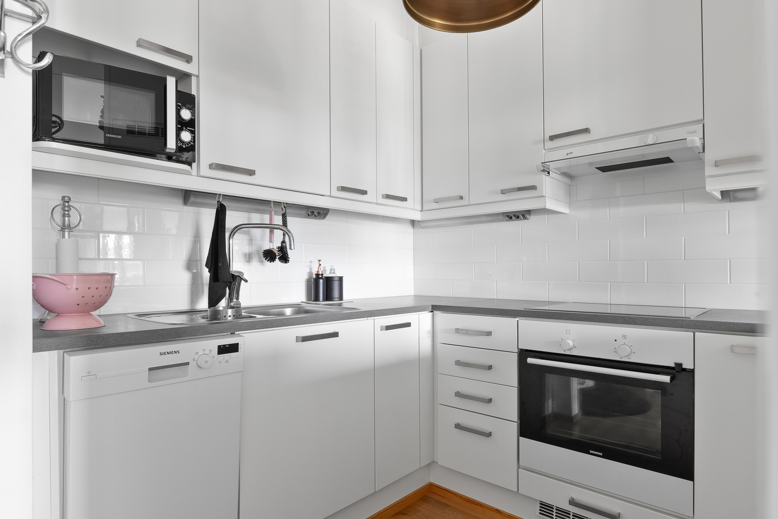 | Keittiön kuvaus | Liesi (Keraaminen liesi), seinät (laatta ja maali), lattiat (laminaatti), astianpesukone, jääkaappipakastin ja liesituuletin |