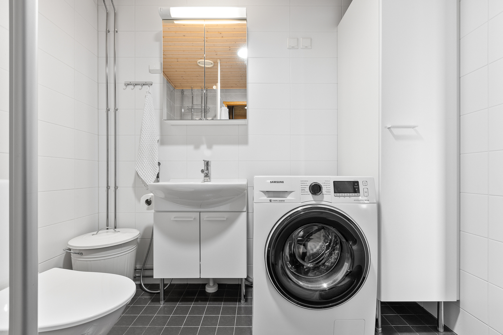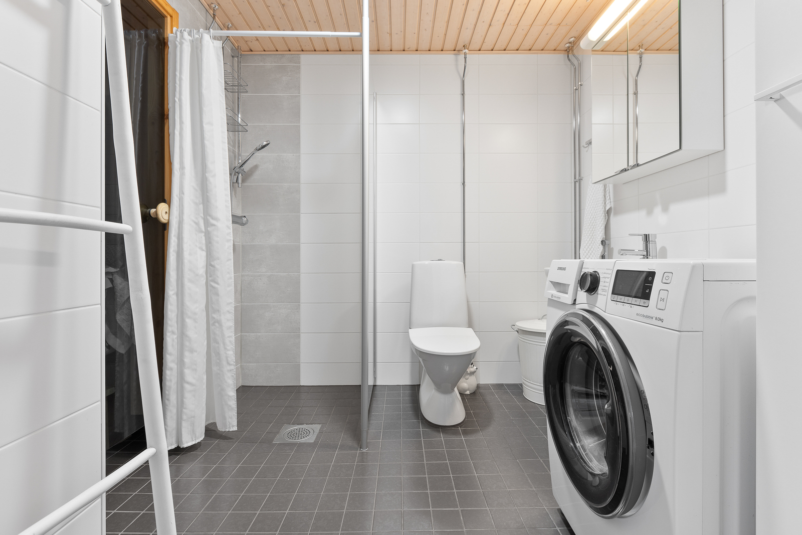 | Kylpyhuoneen kuvaus | Pesukoneliitäntä, wc-istuin, peilikaappi, suihku ja lattialämmitys, seinät (kaakeli), lattiat (laatta) |