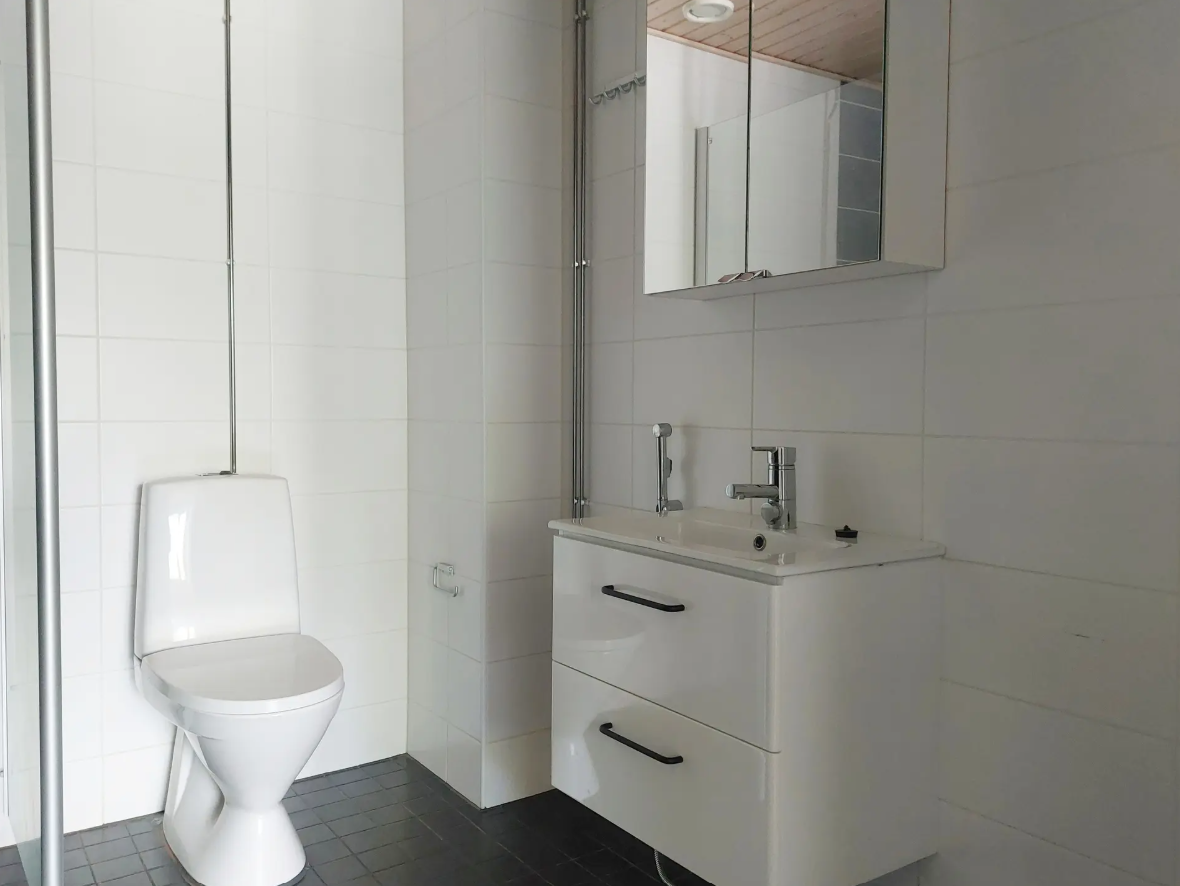 | Kylpyhuoneen kuvaus | Peilikaappi, suihkuseinä, allaskaappi, suihku, pesukoneliitäntä, lattialämmitys ja wc-istuin, seinät (kaakeli), lattiat (laatta) |