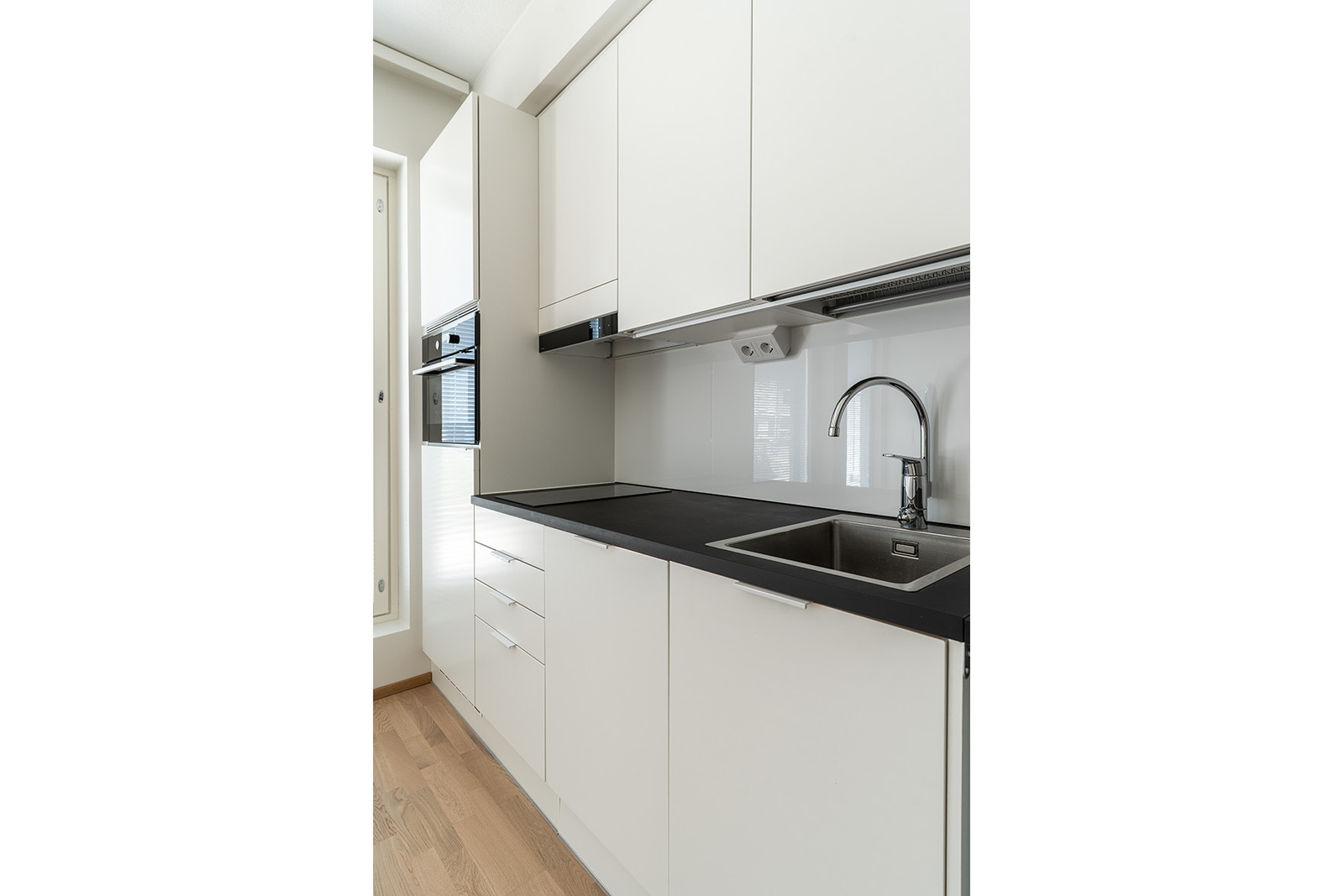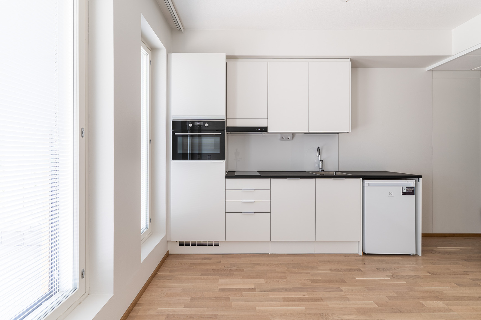 | Keittiön kuvaus | Liesi (Induktioliesi ja erillisuuni), seinät (maali), lattiat (parketti), liesi, liesituuletin, erillisuuni, astianpesukone, jääkaappipakastin, mikroaaltouuni ja kiinteät valaisimet |