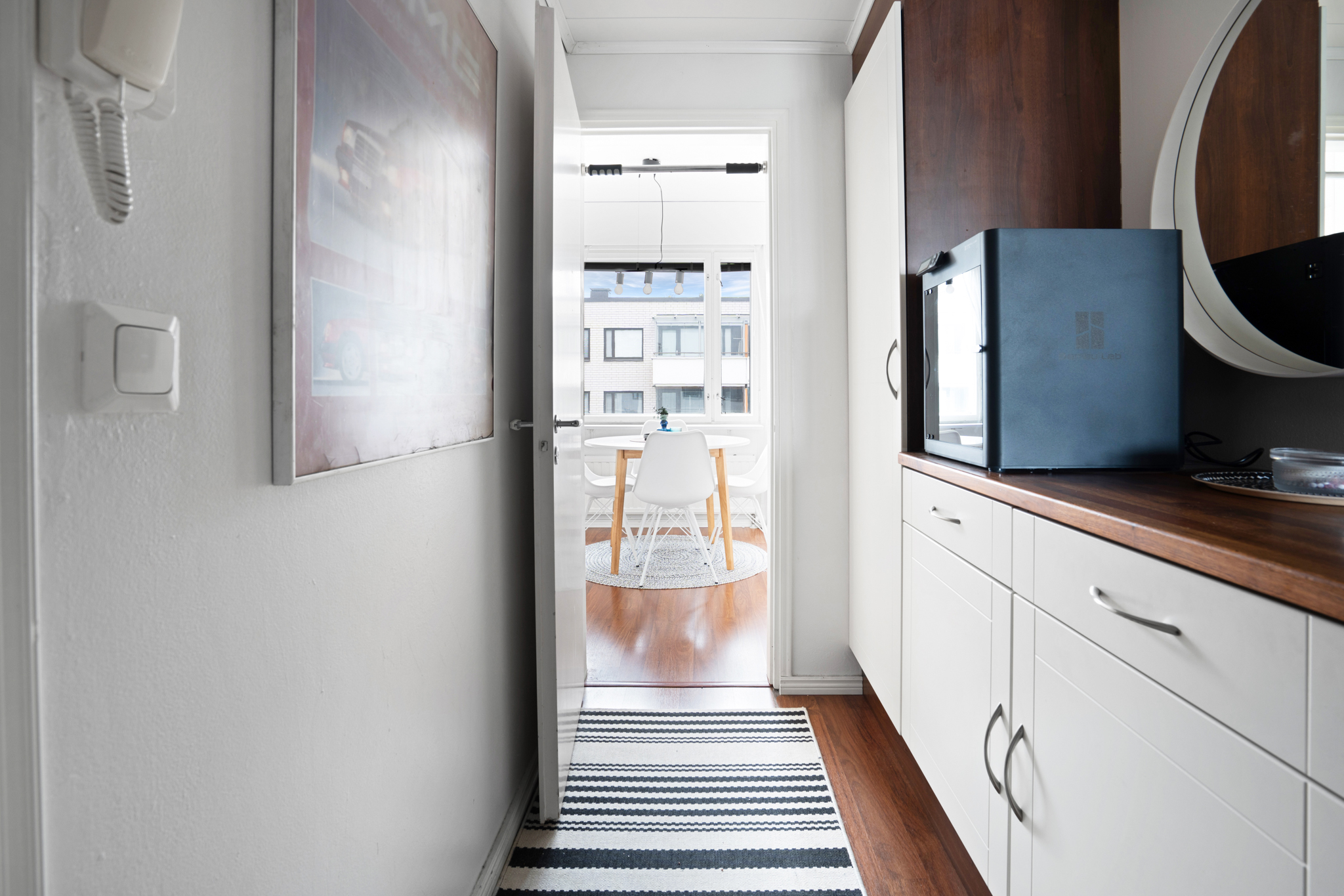 | Tilojen kuvaus | Eteisessä seinäkaapisto ja peilipöytä |