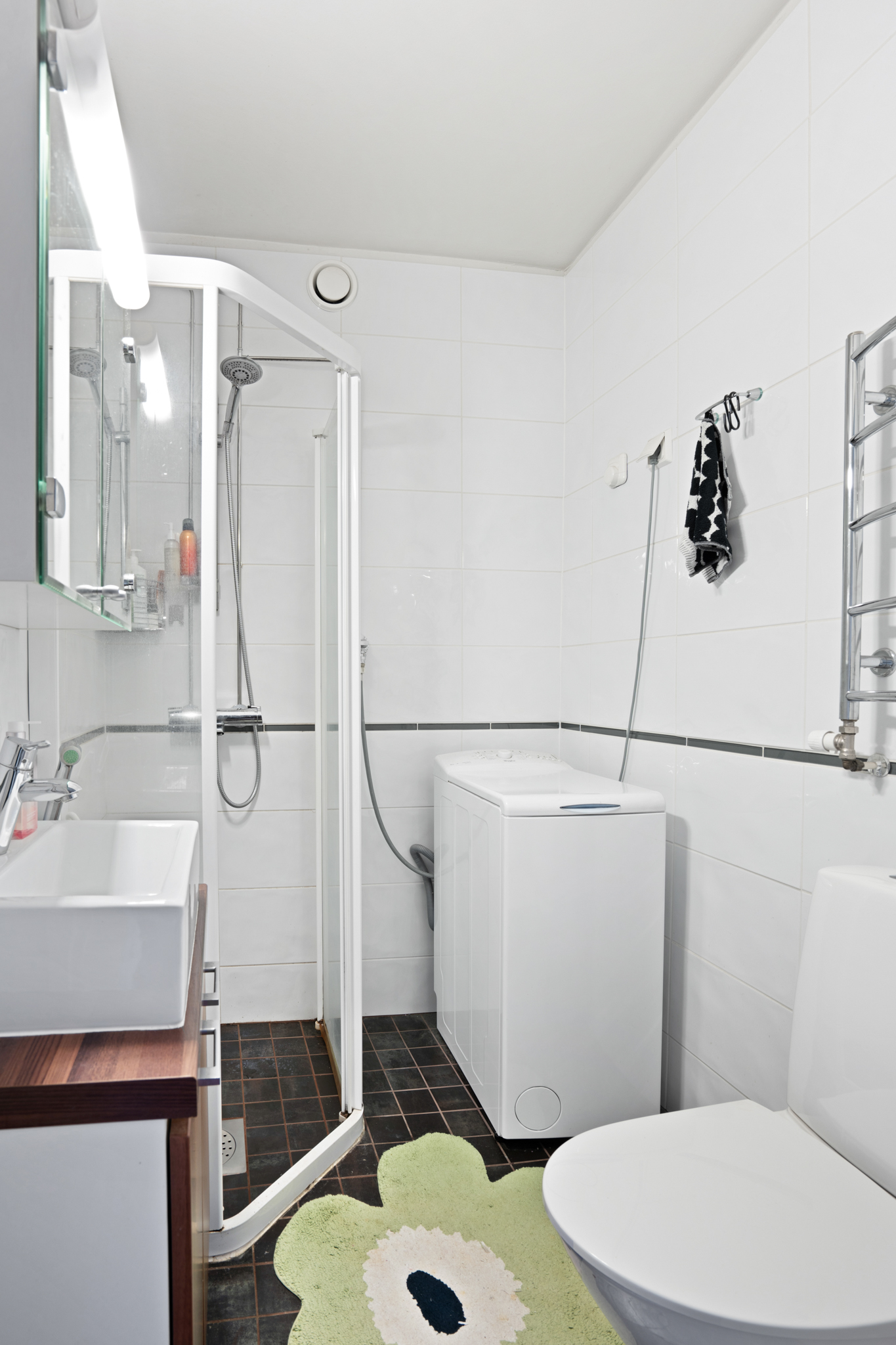 | Kylpyhuoneen kuvaus | WC-istuin, suihku, suihkuseinä, peilikaappi, pesuallas, allaskaappi ja bidee-suihku, seinät (kaakeli), lattiat (laatta) |