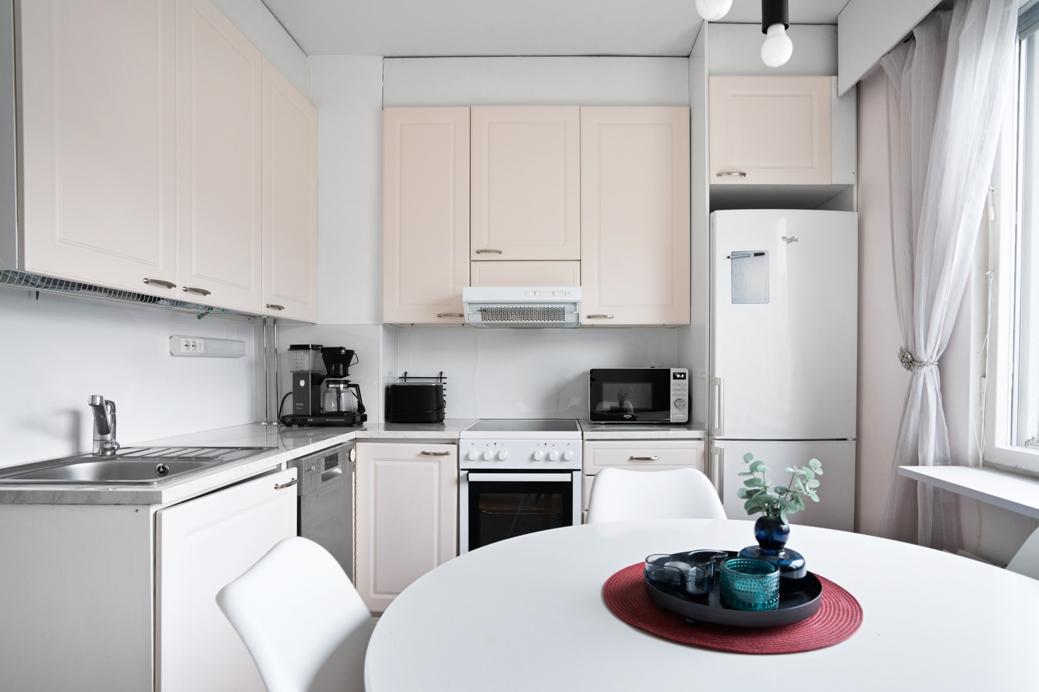 | Keittiön kuvaus | Liesi (Keraaminen liesi), työtasot (laminaatti), seinät (maali), lattiat (laminaatti), jääkaappipakastin, uuni, liesi, astianpesukone ja liesituuletin |