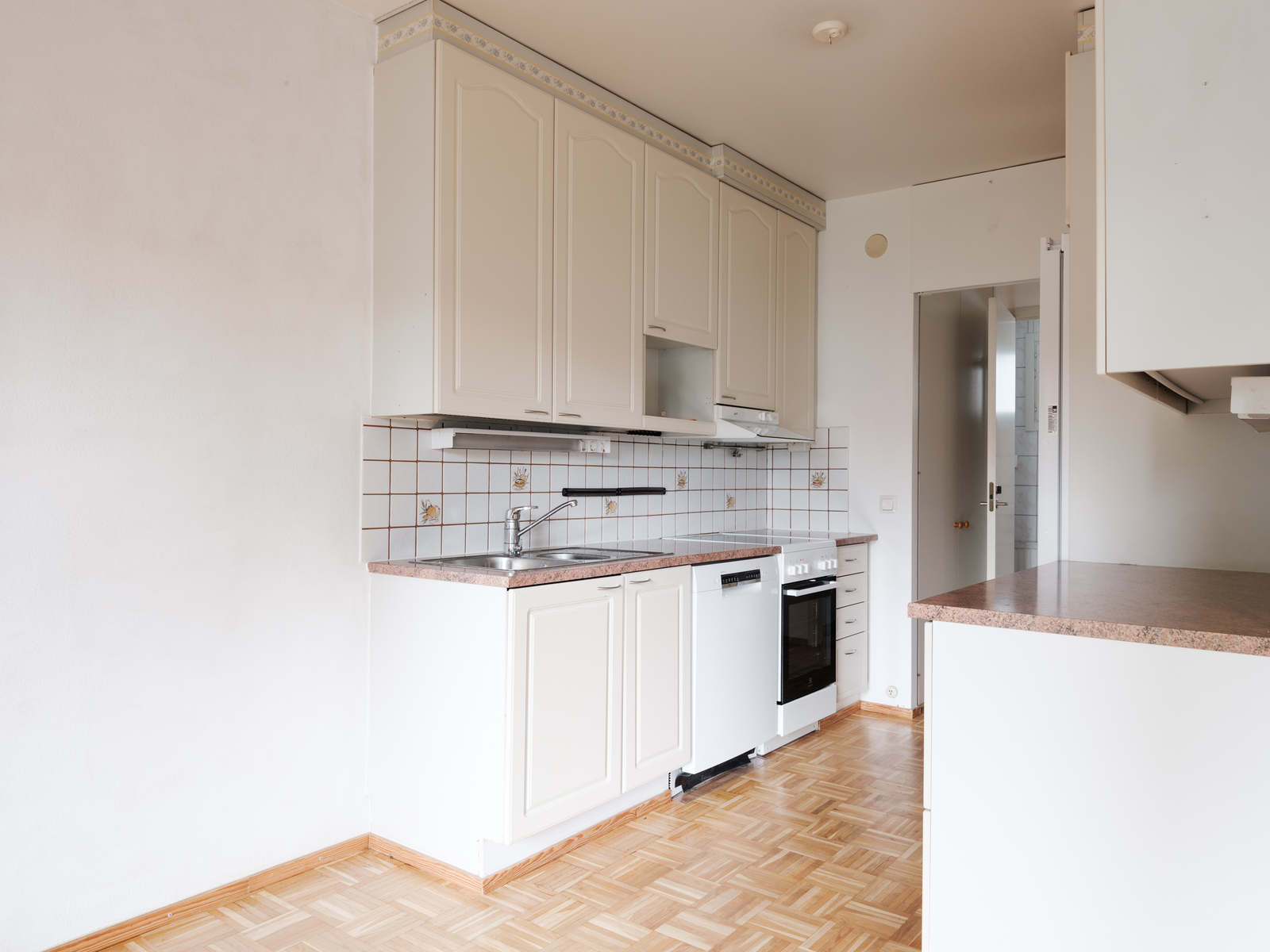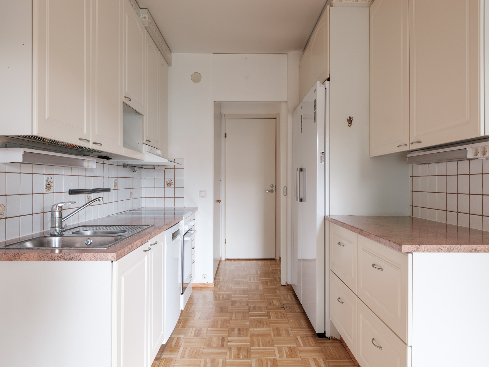 | Keittiön kuvaus | Liesi (Keraaminen liesi), työtasot (laminaatti), seinät (laatta ja maali), lattiat (parketti), jääkaappi, erillinen pakastin, astianpesukone ja liesituuletin / hormi |