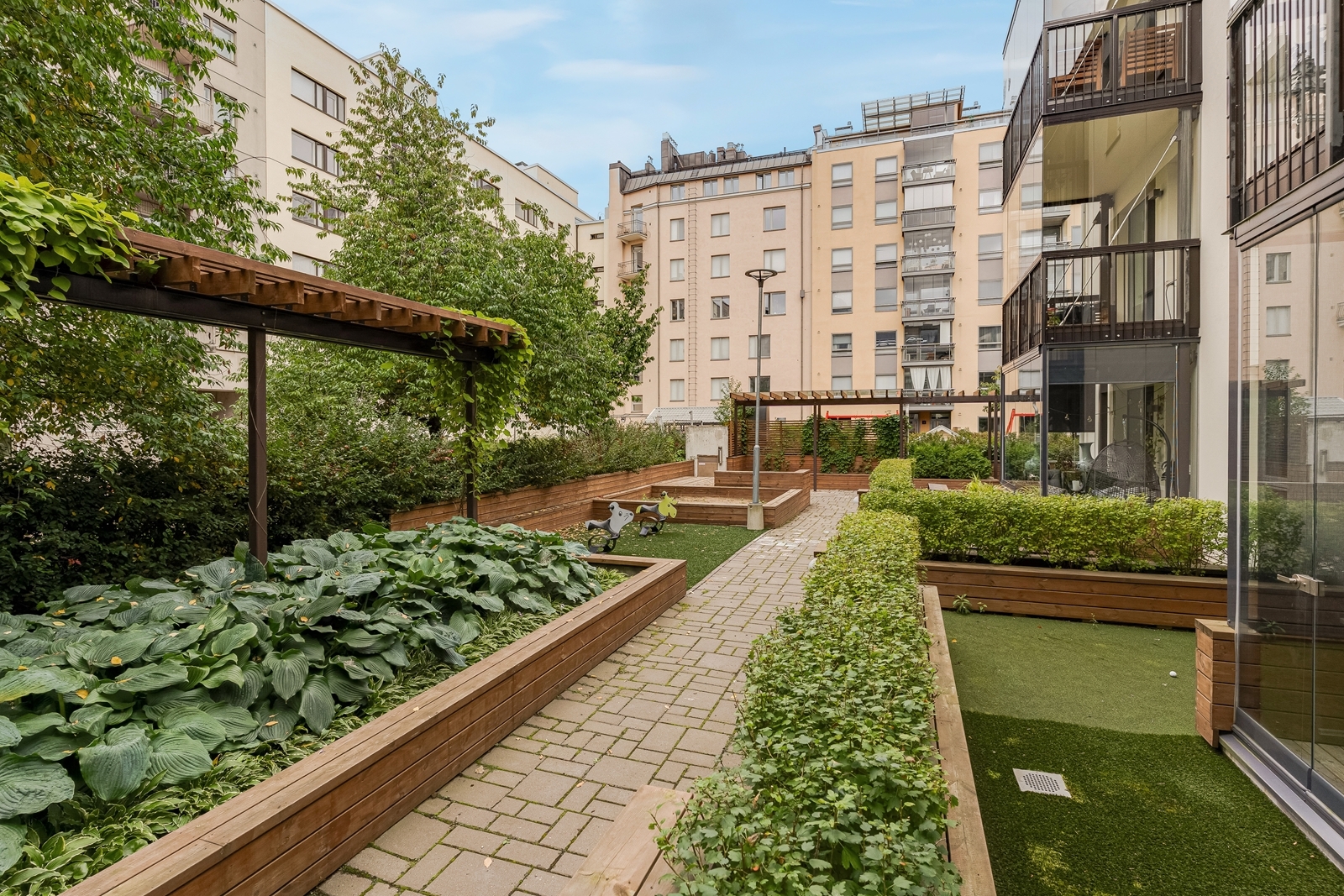 – Vehreä sisäpiha lasten leikkipaikkoineen kutsuu viihtymään.