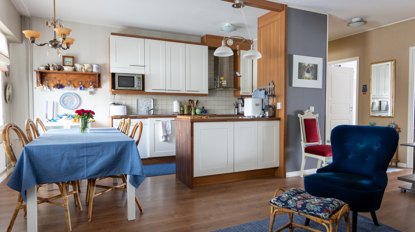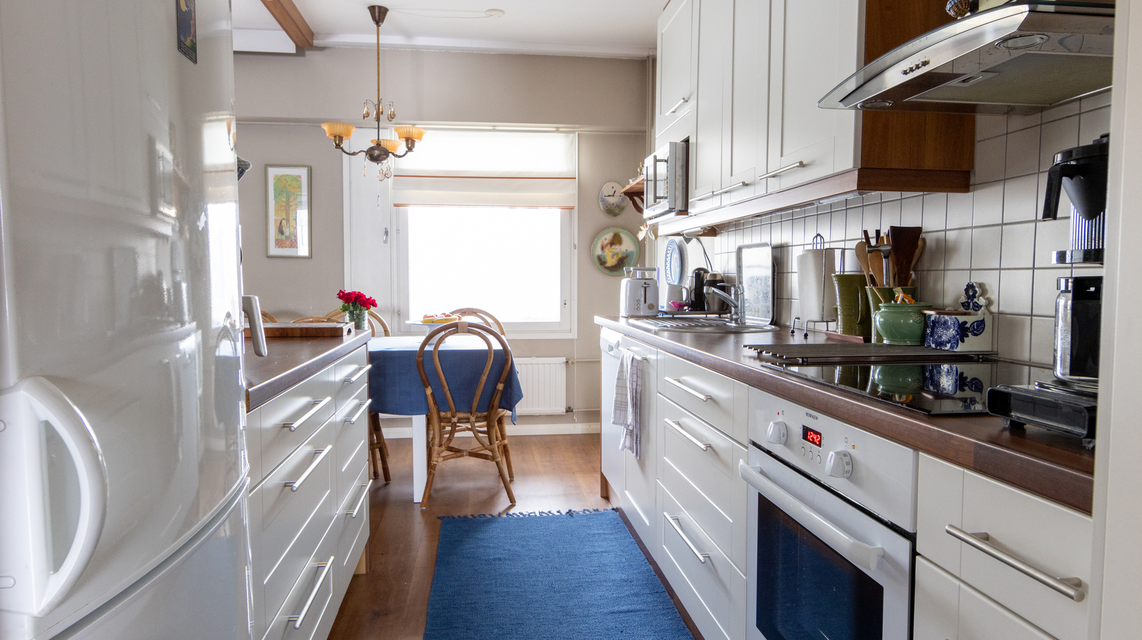 Liesi (Keraaminen liesi ja erillisuuni), seinät (tapetti), lattiat (laminaatti), astianpesukone, erillisuuni, jääkaappipakastin ja liesituuletin |