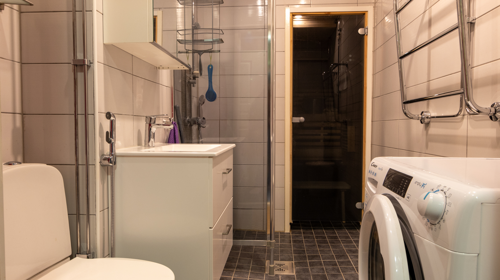 Lattialämmitys, peilikaappi, suihku, wc-istuin ja kiinteät valaisimet, seinät (kaakeli), lattiat (laatta) |