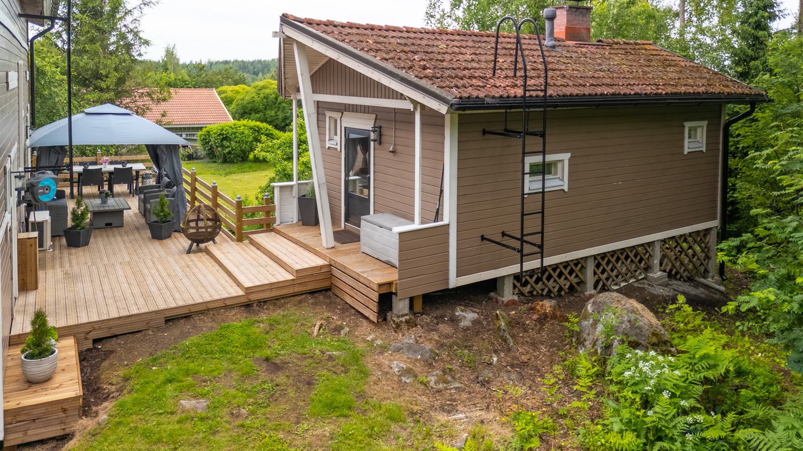 Pihassa erillinen saunarakennus, jossa sauna, pesuhuone, tupa ja wc.