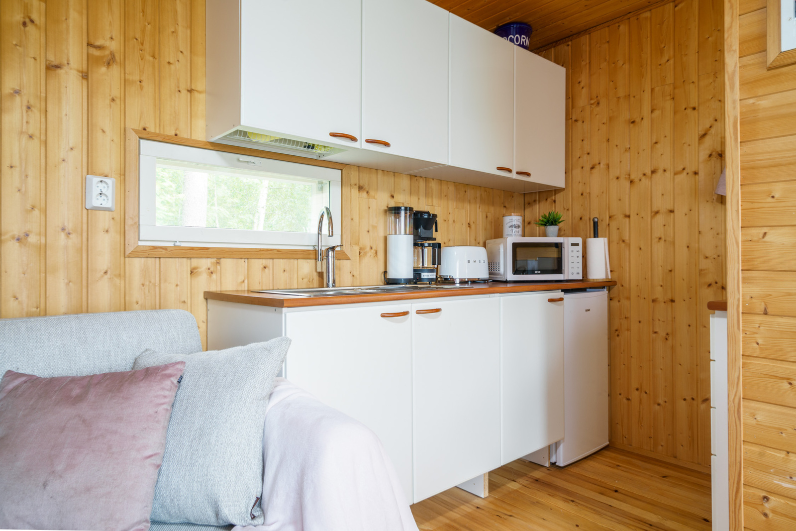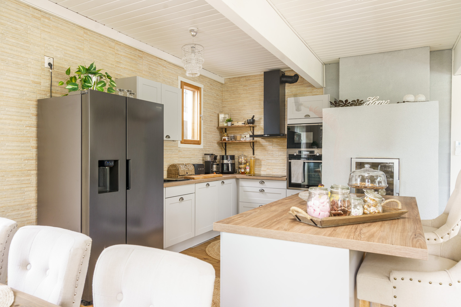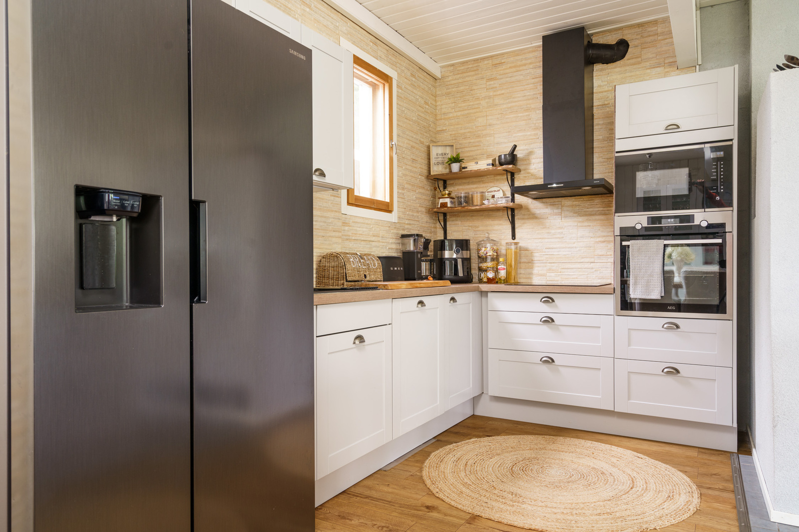| Keittiön kuvaus | Liesi (Induktioliesi ja erillisuuni), työtasot (laminaatti), seinät (laatta), lattiat (vinyyli), erillisuuni, liesituuletin, liesi, jääkaappi, mikroaaltouuni, astianpesukone ja erillinen pakastin |
