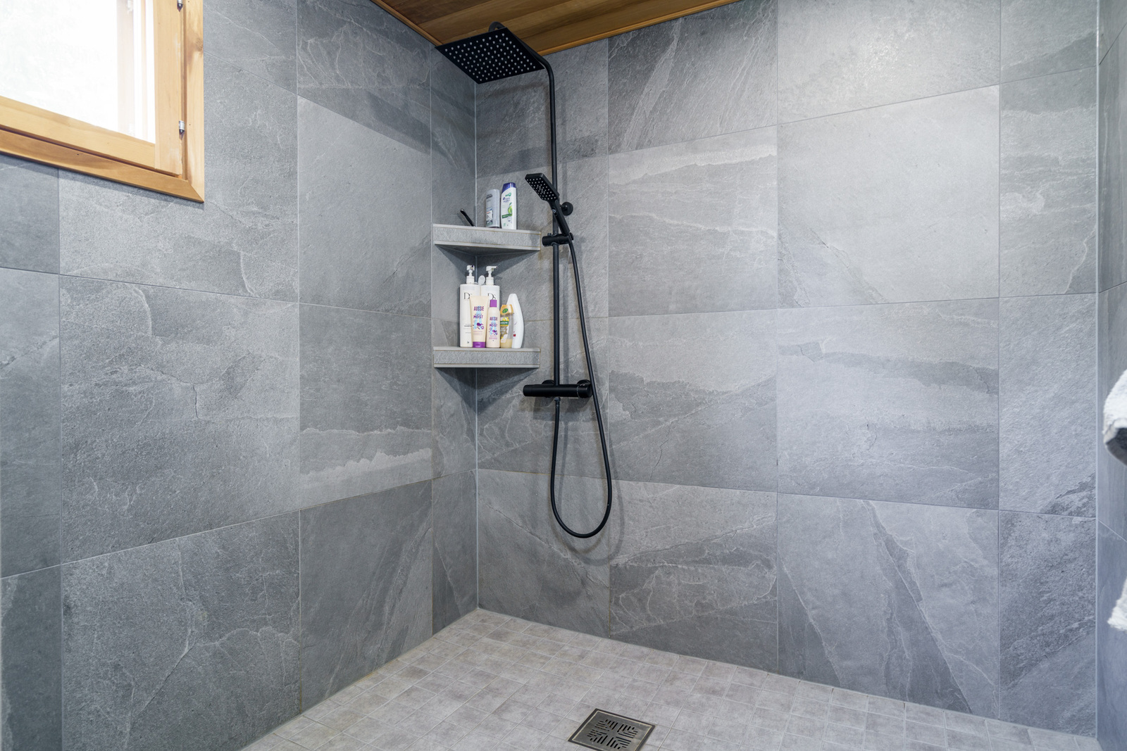 | Kylpyhuoneen kuvaus | Lattialämmitys ja suihku, seinät (kaakeli), lattiat (laatta) |