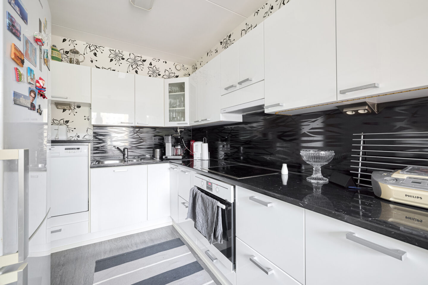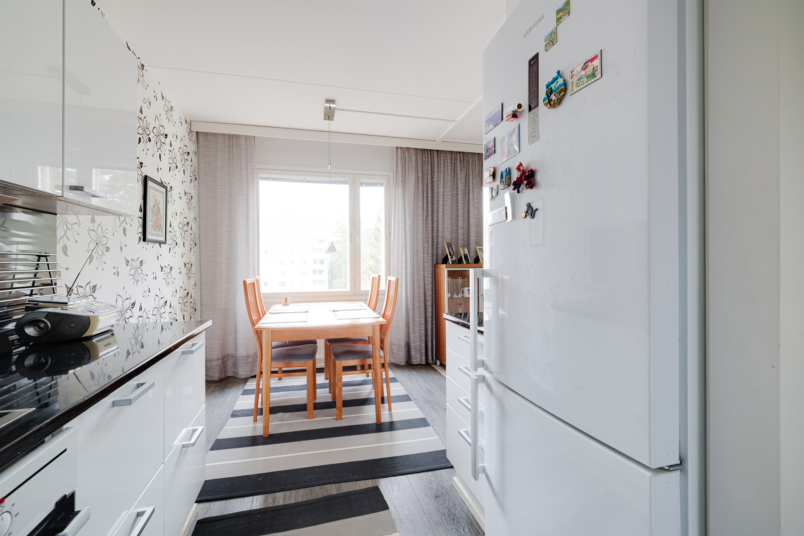 | Keittiön kuvaus | Liesi (Keraaminen liesi), työtasot (laminaatti), seinät (tapetti), lattiat (vinyyli), astianpesukone, jääkaappipakastin ja liesituuletin |