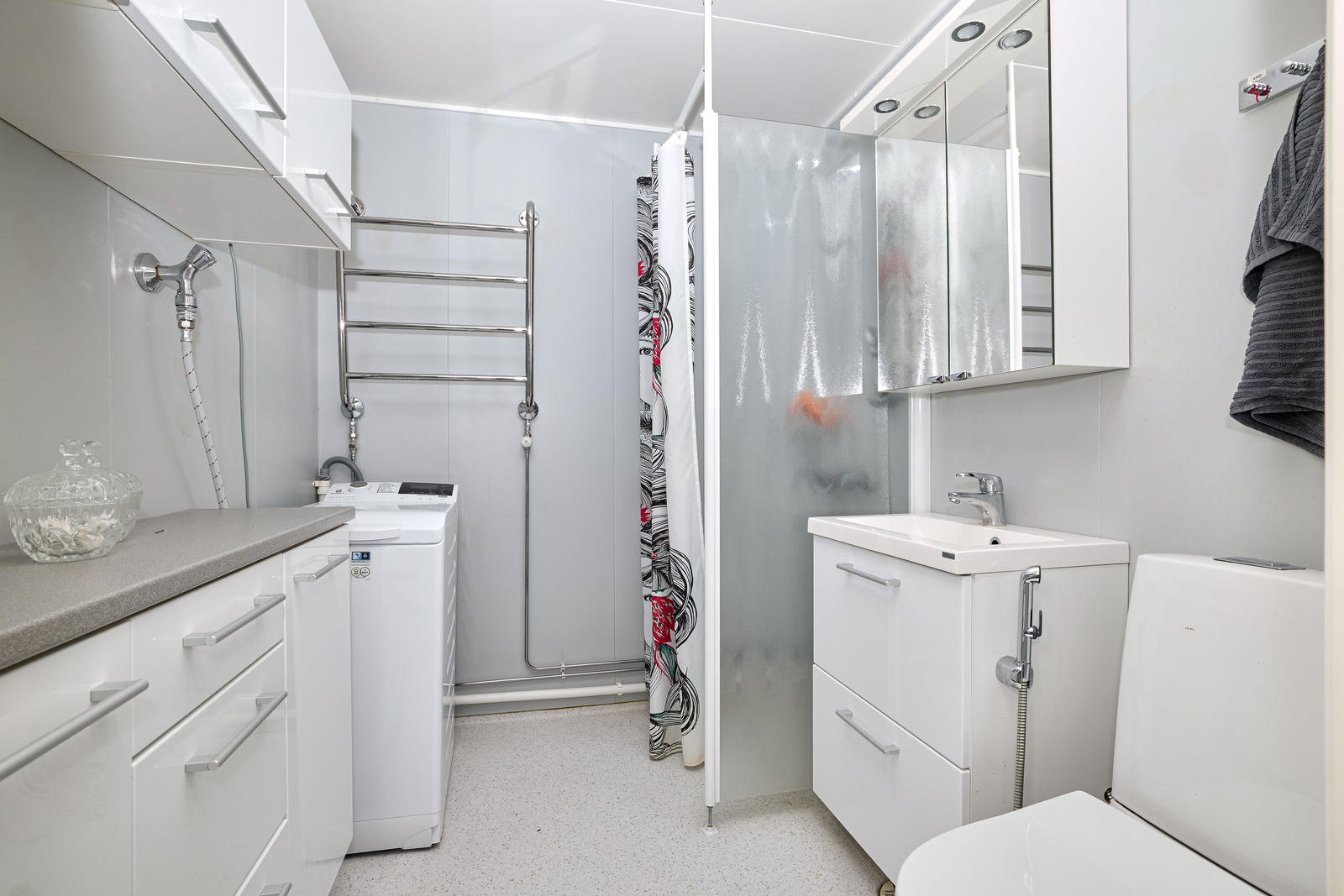 | Kylpyhuoneen kuvaus | Peilikaappi, suihkuseinä, suihku, wc-istuin, allaskaappi ja pesukoneliitäntä, seinät (maali), lattiat (muovimatto) |