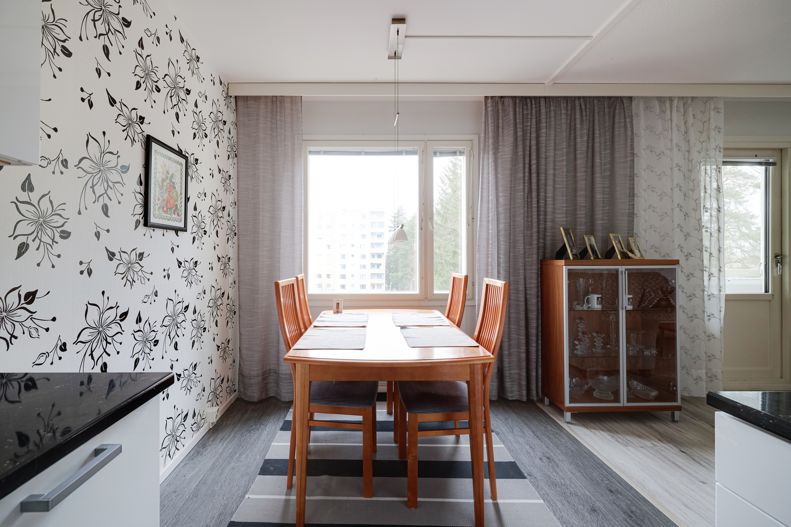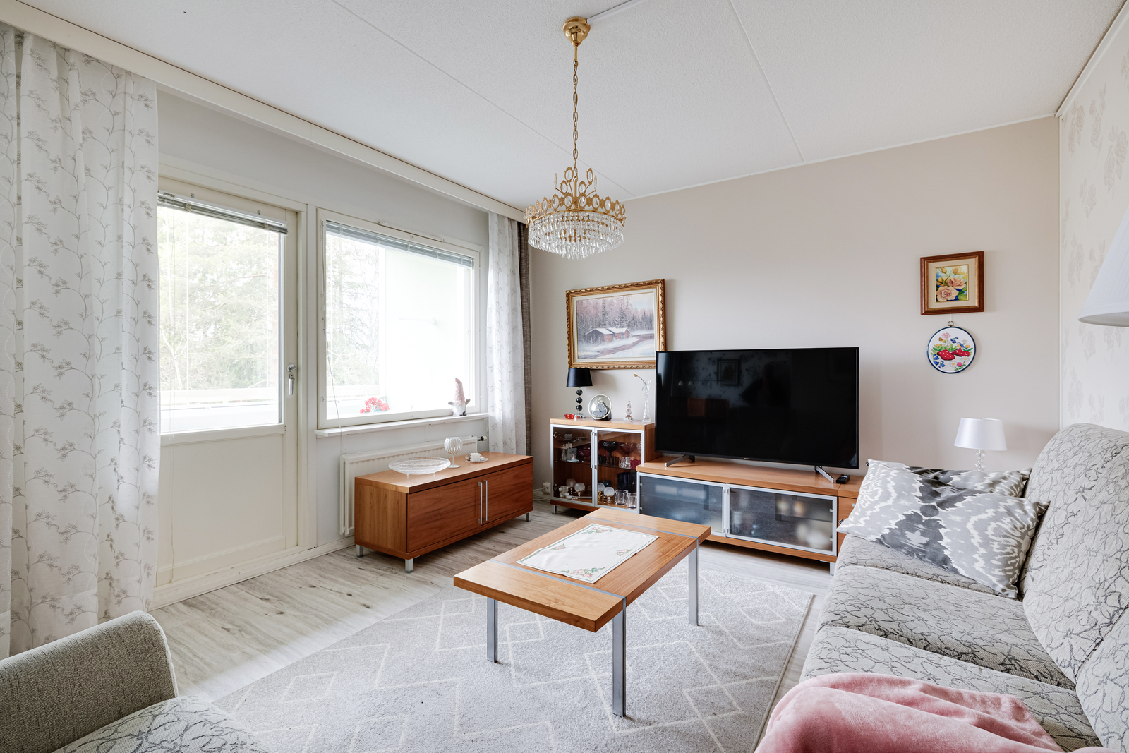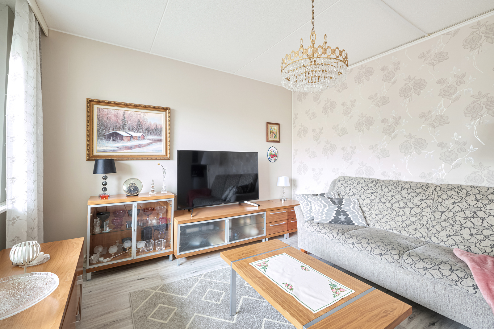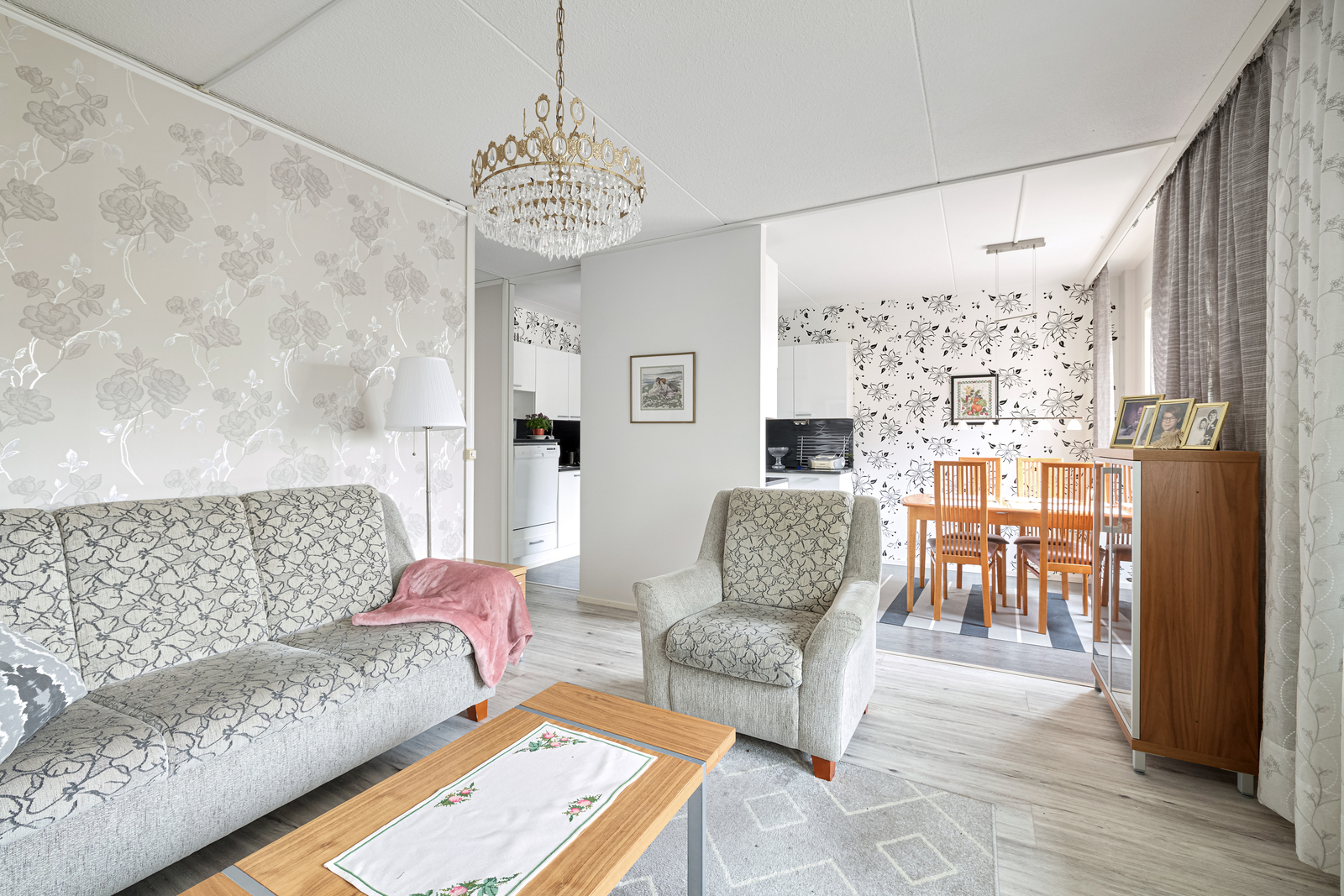| Olohuoneen kuvaus | Seinät (tapetti), lattiat (vinyyli) |
