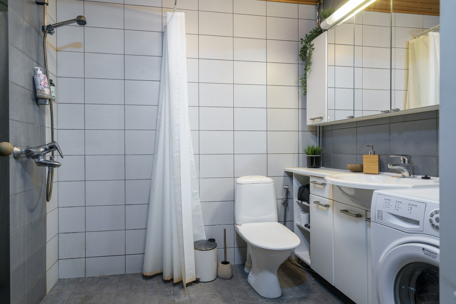 | Kylpyhuoneen kuvaus | WC-istuin, lattialämmitys, suihkuseinä, pesukoneliitäntä ja suihku, seinät (kaakeli), lattiat (laatta) |