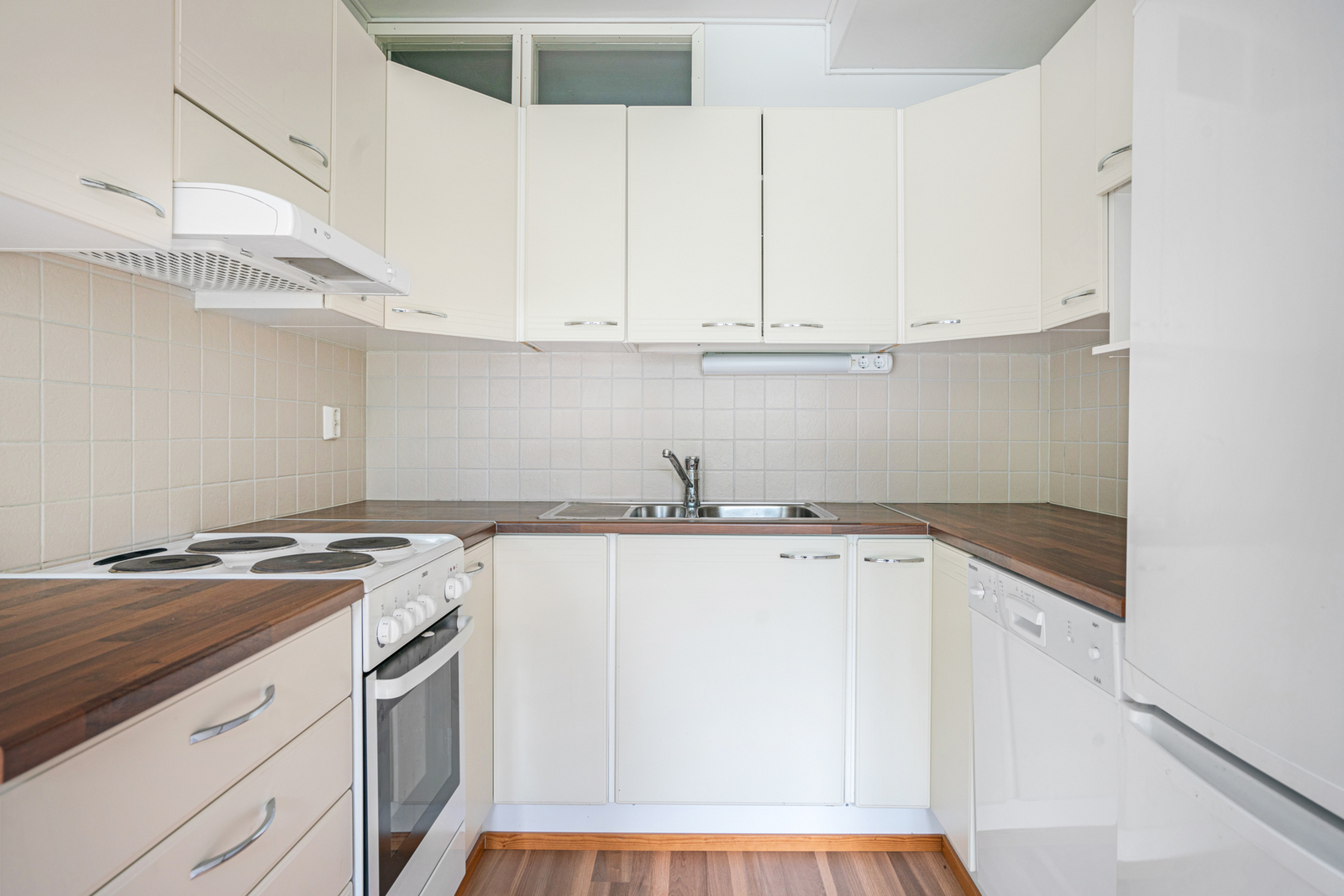 | Keittiön kuvaus | Liesi (sähköliesi), työtasot (laminaatti), seinät (maali ja osalaatoitus), lattiat (laminaatti), liesituuletin, liesi ja jääkaappipakastin |