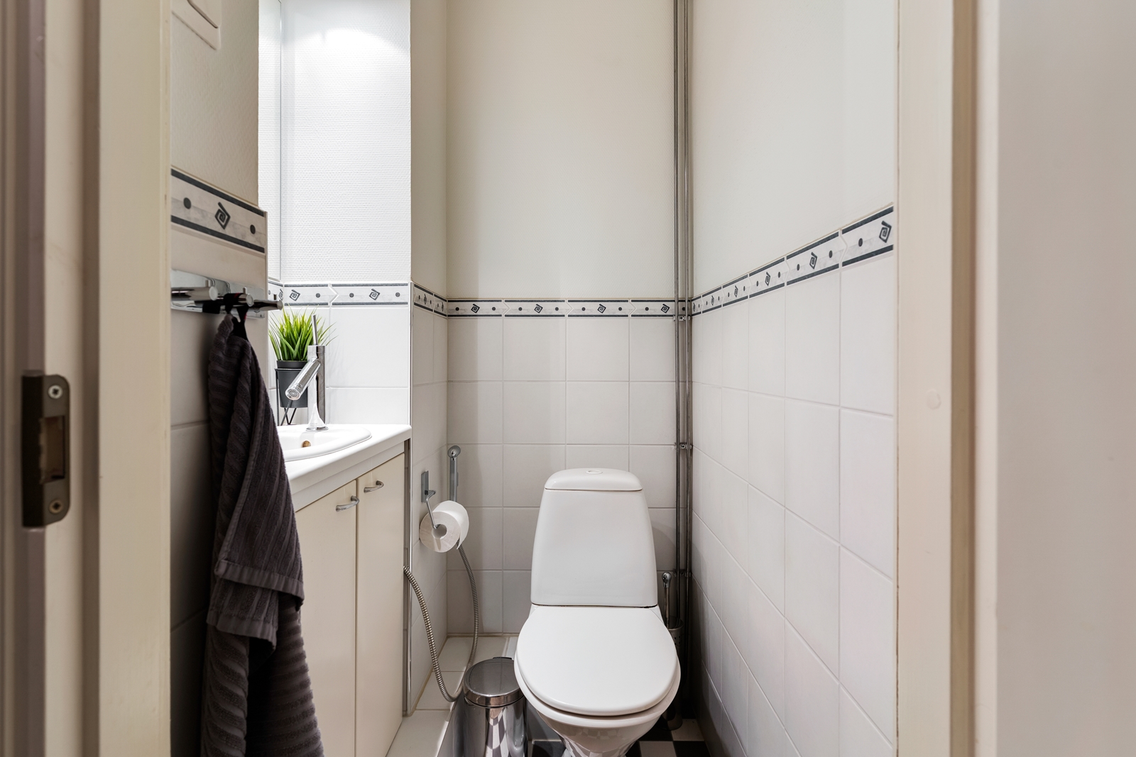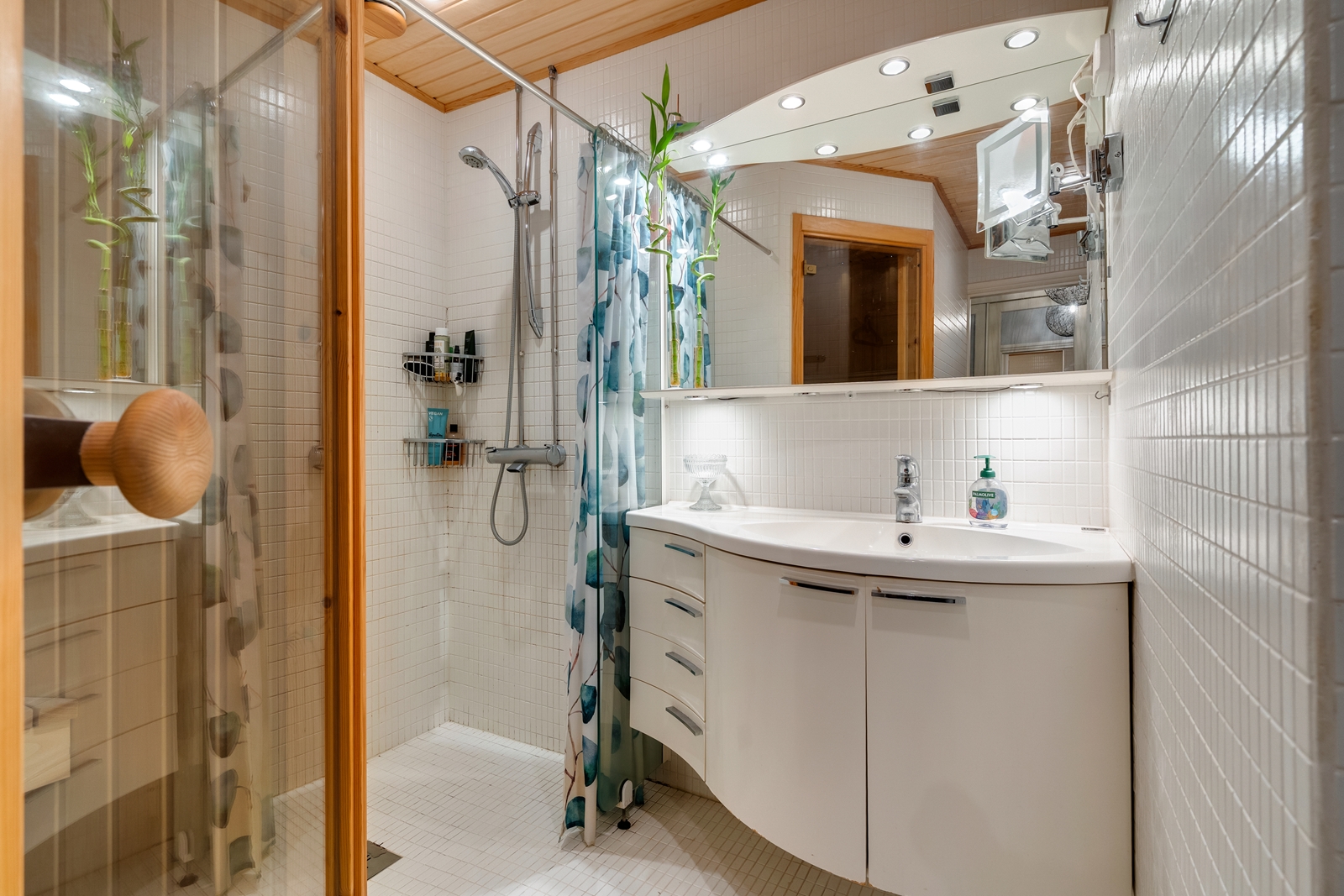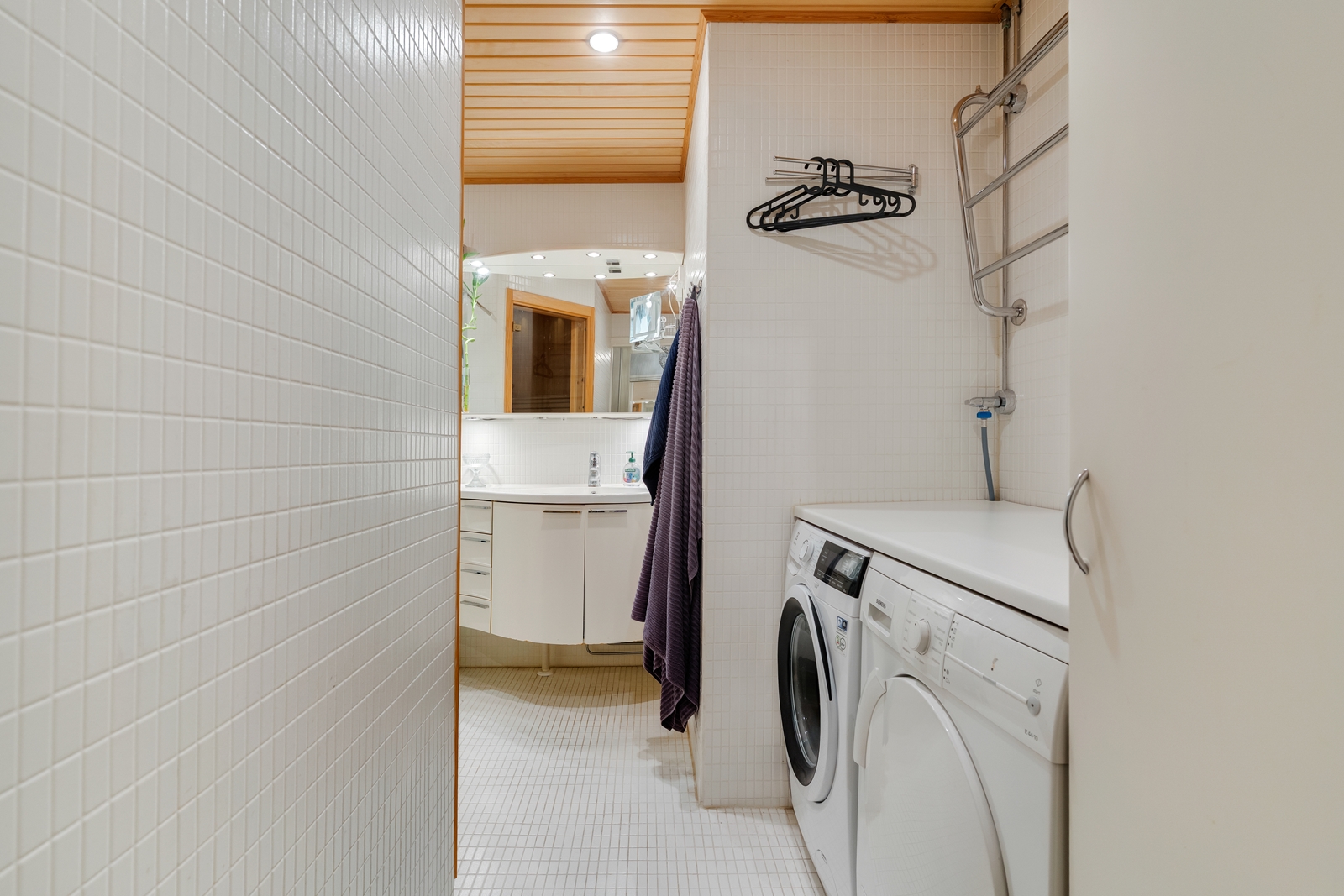 | Kylpyhuoneen kuvaus | Suihku, pesukoneliitäntä, peilikaappi, wc-istuin, suihkuseinä ja pesukone ja kuivausrumpu kuuluvat kauppaan., seinät (kaakeli), lattiat (laatta) |