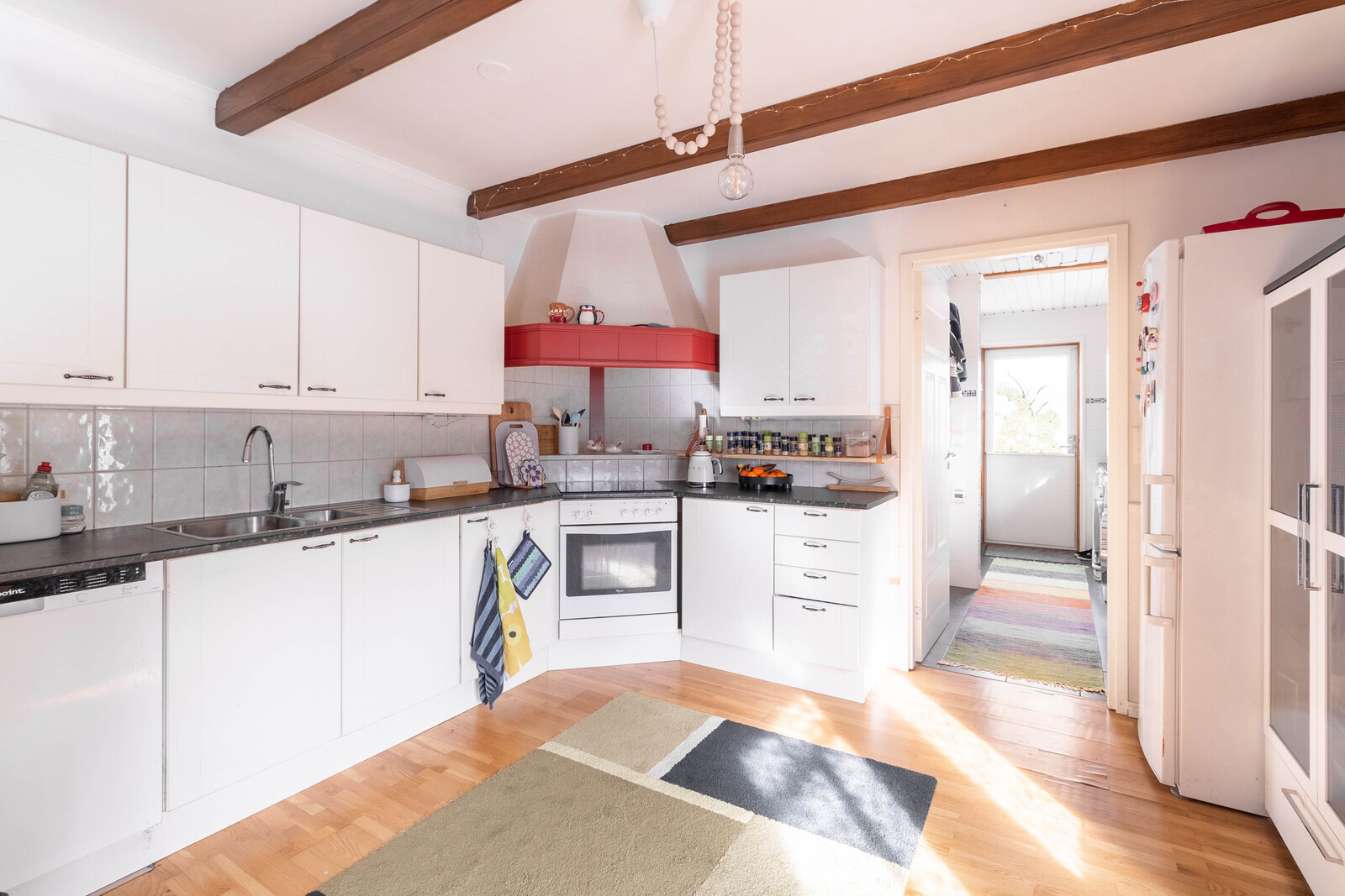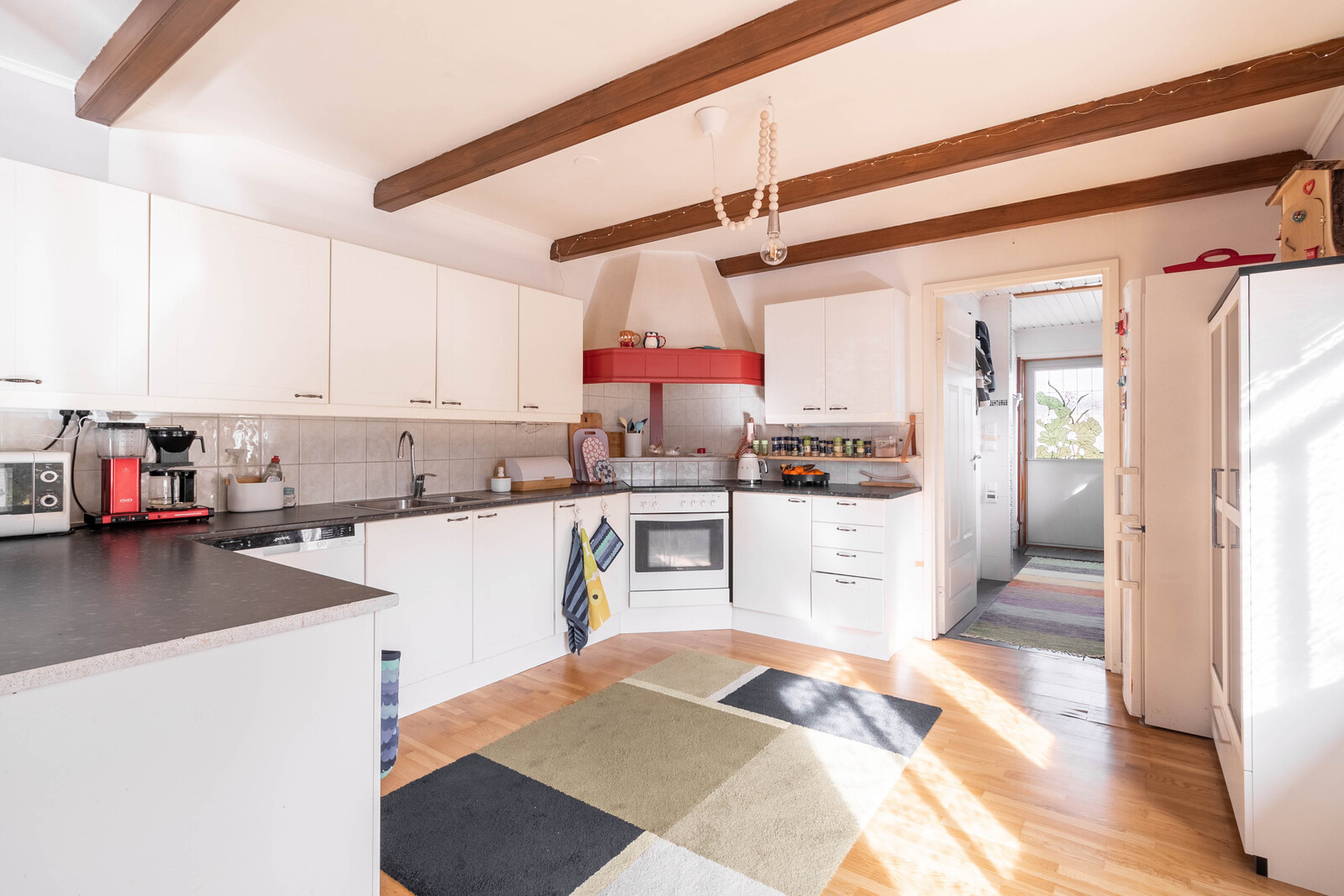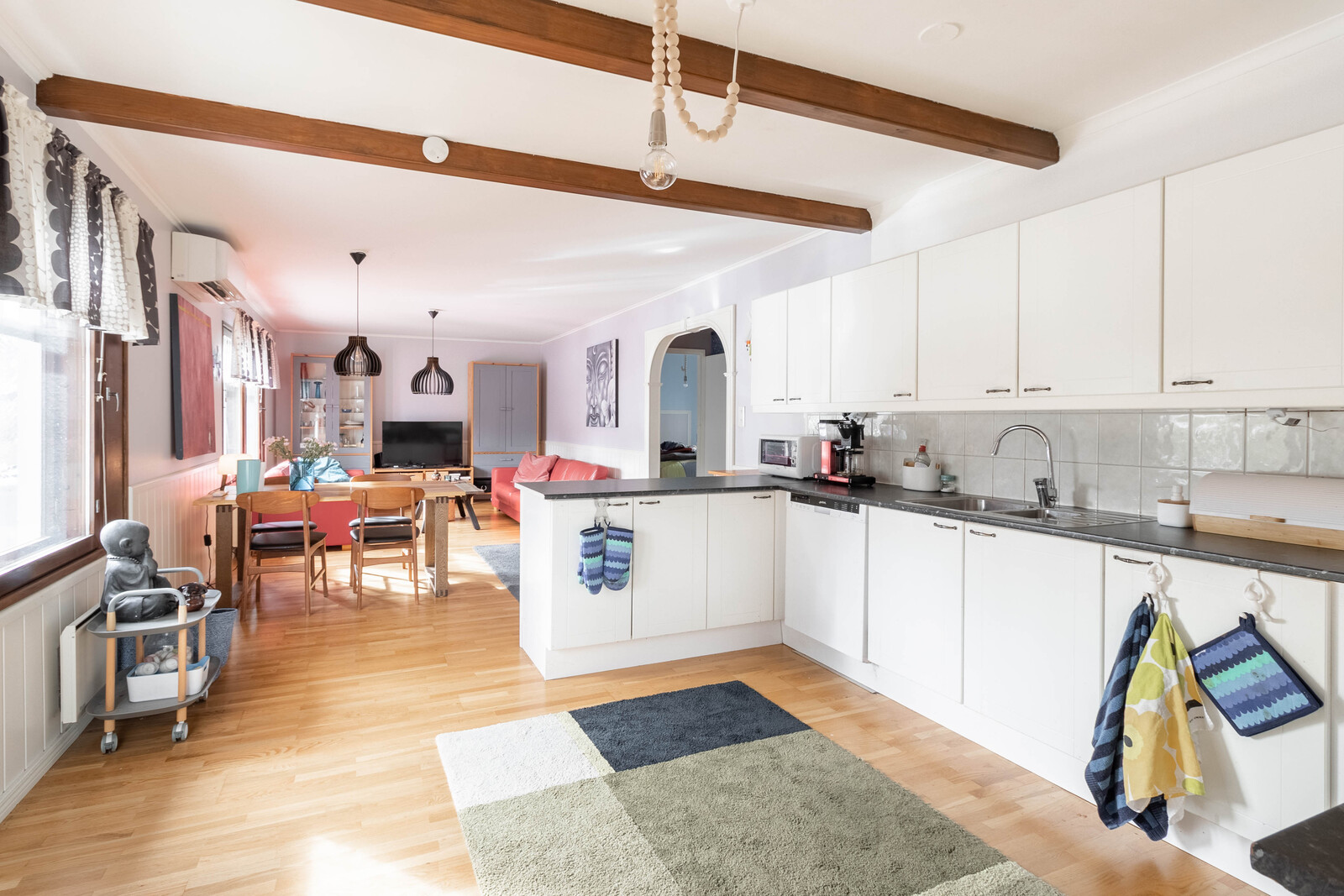 Liesi (Induktioliesi ja erillisuuni), työtasot (laminaatti), seinät (tapetti ja maali), lattiat (parketti), liesi, astianpesukone, erillisuuni, jääkaappipakastin ja kiinteät valaisimet, liesituuletin / hormi |