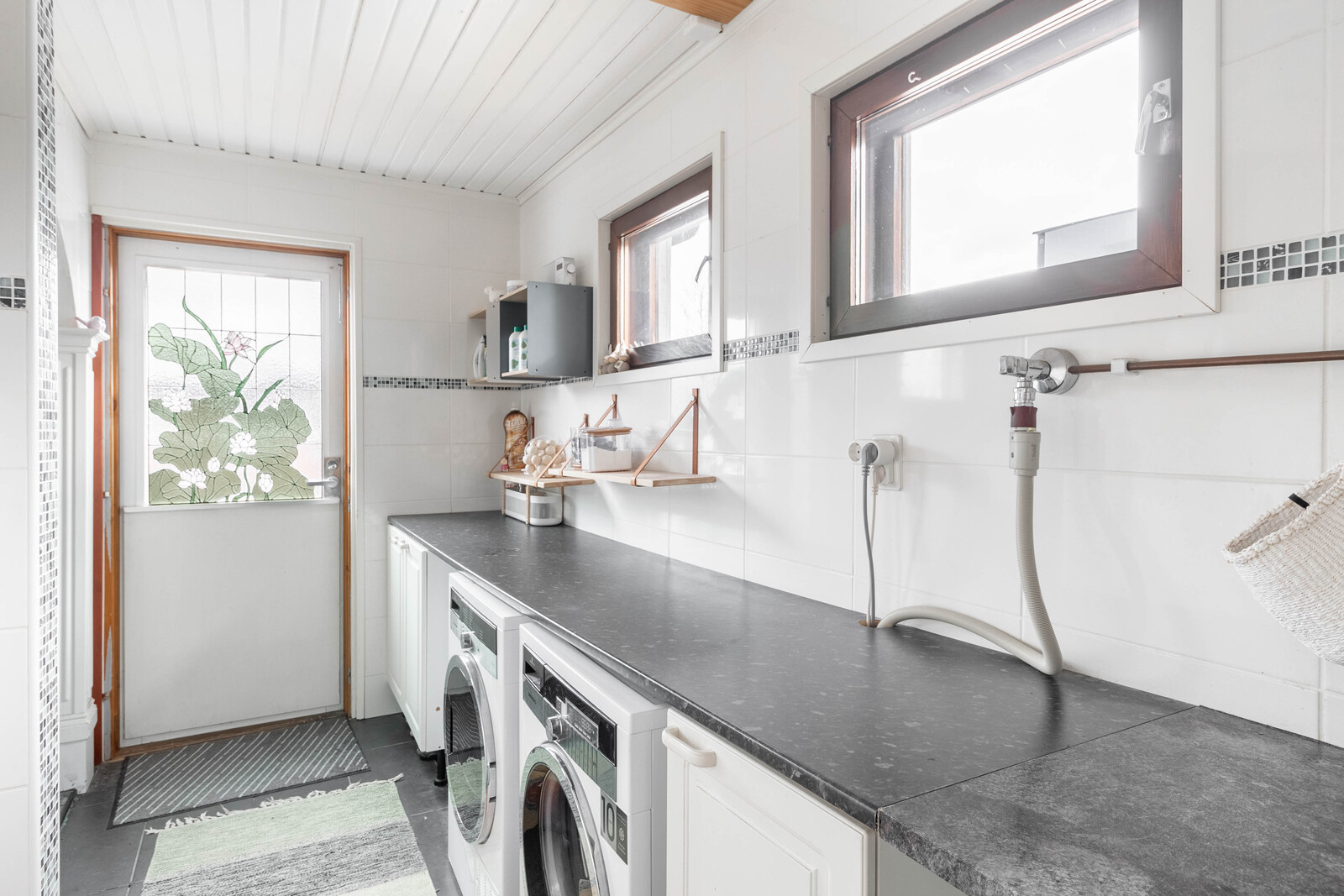 Pesukoneliitäntä, lastenhoitopöytä/taso ja pyyhekuivain / seinäpatteri, lattiat (laatta), seinät (kaakeli), tila myös kuivurille |