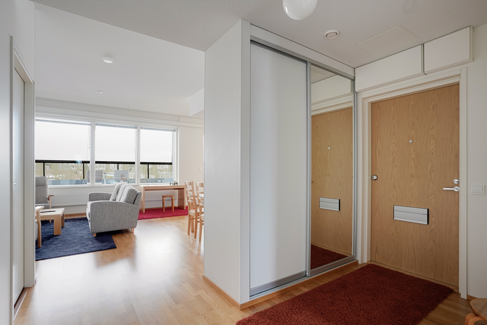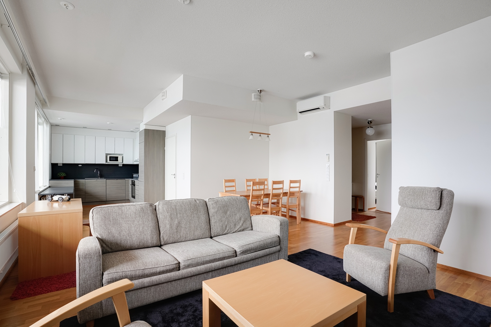 Asunnossa on kaksi makuuhuonetta, tilava olohuone, nykyaikainen keittiö sekä oma sauna. Parveke on osittain lasitettu, mikä tarjoaa mukavan lisätilan ympäri vuoden. Lattiat ovat kauttaaltaan parkettia, mikä tuo lämpöä ja tyylikkyyttä sisustukseen.